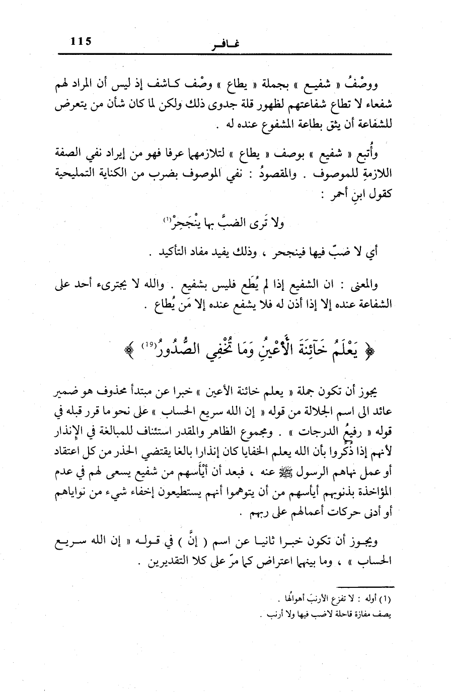 وَوَصْفُ: شَفِيعٍ بِجُمْلَةِ يُطاعُ وَصْفٌ كَاشِفٌ إِذْ لَيْسَ أَنَّ الْمُرَادَ لَهُمْ شُفَعَاءُ لَا تُطَاعُ شَفَاعَتُهُمْ لِظُهُورِ قِلَّةِ جَدْوَى ذَلِكَ وَلَكِنْ لَمَّا كَانَ شَأْنُ مَنْ يَتَعَرَّضُ لِلشَّفَاعَةِ أَنْ يَثِقَ بِطَاعَةِ الْمَشْفُوعِ عِنْدَهُ لَهُ. وَأَتْبَعَ شَفِيعٍ بِوَصْفِ يُطاعُ لِتَلَازُمِهِمَا عُرْفًا فَهُوَ مِنْ إِيرَادِ نَفْيِ الصِّفَةِ اللَّازِمَةِ لِلْمَوْصُوفِ. وَالْمَقْصُودُ: نَفِيُ الْمَوْصُوفِ بِضَرْبٍ مِنِ الْكِنَايَةِ التَّلْمِيحِيَّةِ كَقَوْلِ ابْنِ أَحْمَرَ: