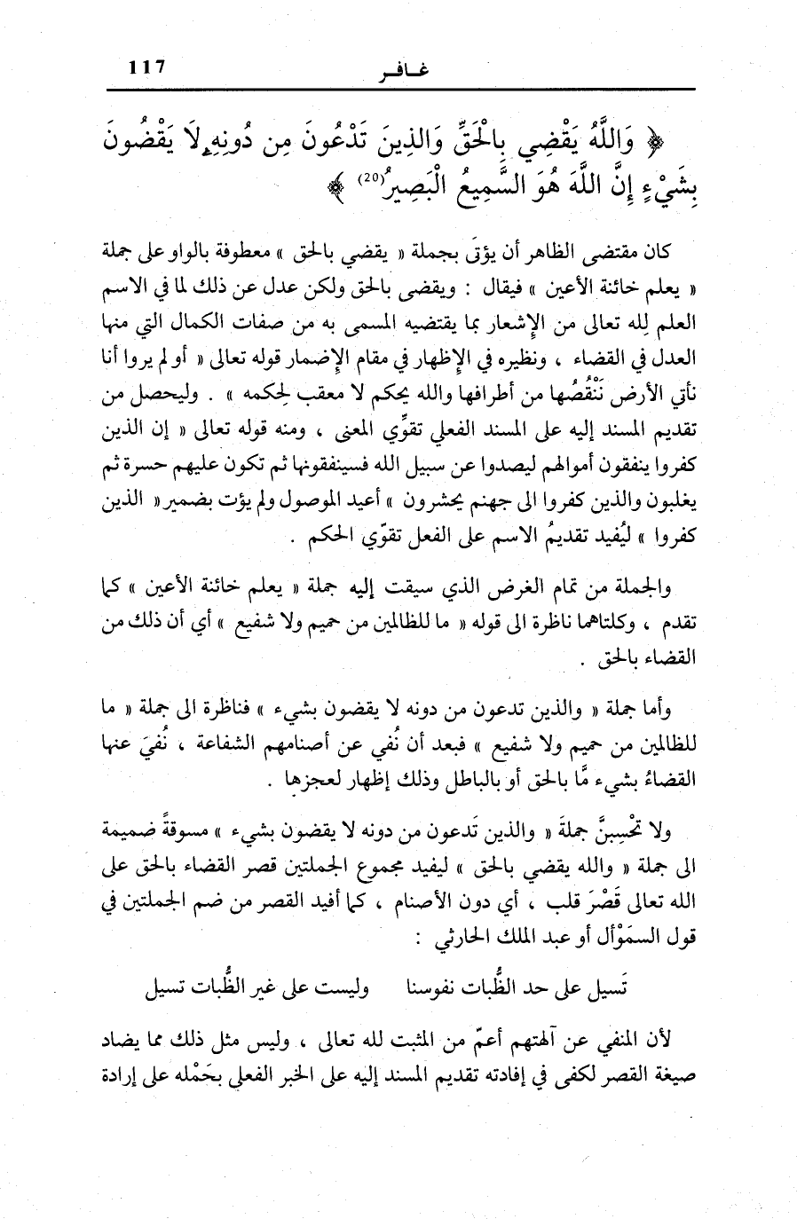 وَأَمَّا جُمْلَةُ وَالَّذِينَ تَدْعُونَ مِنْ دُونِهِ لَا يَقْضُونَ بِشَيْءٍ فَنَاظِرَةٌ إِلَى جُمْلَةِ مَا لِلظَّالِمِينَ مِنْ حَمِيمٍ وَلا شَفِيعٍ [غَافِر: 18] فَبَعْدَ أَنْ نُفِيَ عَنْ أَصْنَامِهِمُ الشَّفَاعَةُ، نُفِيَ عَنْهَا الْقَضَاءُ بِشَيْءٍ مَا بِالْحَقِّ أَوْ بِالْبَاطِلِ وَذَلِكَ إِظْهَارٌ لِعَجْزِهَا. وَلَا تَحْسَبَّنَ جُمْلَةَ وَالَّذِينَ تَدْعُونَ مِنْ دُونِهِ لَا يَقْضُونَ بِشَيْءٍ مَسُوقَةً ضَمِيمَةً إِلَى جُمْلَةِ: وَاللَّهُ يَقْضِي بِالْحَقِّ لِيُفِيدَ مَجْمُوعُ الْجُمْلَتَيْنِ قَصْرَ الْقَضَاءِ بِالْحَقِّ عَلَى اللَّهِ تَعَالَى قَصْرَ قَلْبٍ، أَيْ دُونَ الْأَصْنَامِ، كَمَا أُفِيدَ الْقَصْرُ مِنْ ضَمِّ الْجُمْلَتَيْنِ فِي قَول السموأل أَوْ عَبْدِ الْمَلِكِ الْحَارِثِيِّ: