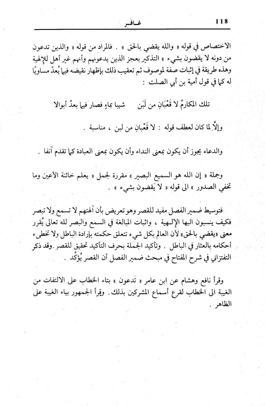 الِاخْتِصَاصِ فِي قَوْلِهِ: وَاللَّهُ يَقْضِي بِالْحَقِّ. فَالْمُرَادُ مِنْ قَوْلِهِ: وَالَّذِينَ تَدْعُونَ مِنْ دُونِهِ لَا يَقْضُونَ بِشَيْءٍ التَّذْكِيرُ بِعَجْزِ الَّذِينَ يَدْعُونَهُمْ وَأَنَّهُمْ غَيْرُ أَهْلٍ لِلْإِلَهِيَّةِ، وَهَذِهِ طَرِيقَةٌ فِي إِثْبَاتِ صِفَةٍ لِمَوْصُوفٍ ثُمَّ تَعْقِيبُ ذَلِكَ بِإِظْهَارِ نَقِيضِهِ فِيمَا يُعَدُّ مُسَاوِيًا لَهُ كَمَا فِي قَوْلِ أُمَيَّةَ بْنِ أَبِي الصَّلْتِ: