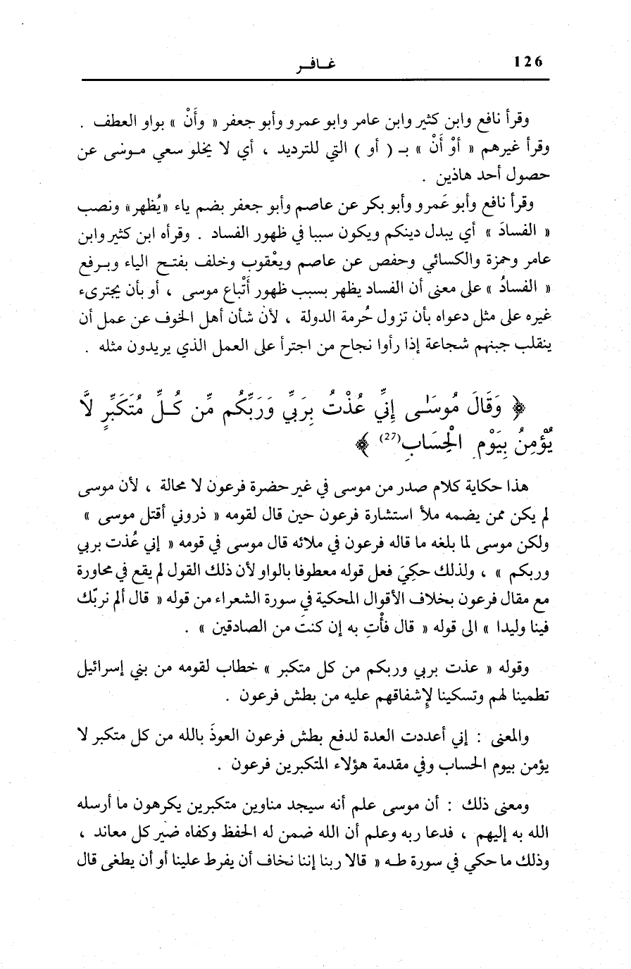 وَقالَ مُوسى إِنِّي عُذْتُ بِرَبِّي وَرَبِّكُمْ مِنْ كُلِّ مُتَكَبِّرٍ لَا يُؤْمِنُ بِيَوْمِ الْحِسابِ (27)