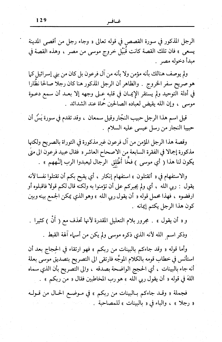 الرَّجُلِ الْمَذْكُورِ فِي سُورَةِ الْقَصَصِ [20] فِي قَوْلِهِ تَعَالَى: وَجاءَ رَجُلٌ مِنْ أَقْصَى الْمَدِينَةِ يَسْعى فَإِنَّ تِلْكَ الْقِصَّةَ كَانَتْ قُبَيْلَ خُرُوجِ مُوسَى مِنْ مِصْرَ، وَهَذِهِ الْقِصَّةُ فِي مَبْدَأِ دُخُولِهِ مِصْرَ. وَلَمْ يُوصَفْ هُنَالِكَ بِأَنَّهُ مُؤْمِنٌ وَلَا بِأَنَّهُ مِنْ آلِ فِرْعَوْنَ بَلْ كَانَ مِنْ بَنِي إِسْرَائِيلَ كَمَا هُوَ صَرِيحُ سِفْرِ الْخُرُوجِ. وَالظَّاهِرُ أَنَّ الرَّجُلَ الْمَذْكُورَ هُنَا كَانَ رَجُلًا صَالِحًا نَظَّارًا فِي أَدِلَّةِ التَّوْحِيدِ وَلَمْ يَسْتَقِرَّ الْإِيمَانُ فِي قَلْبِهِ عَلَى وَجْهِهِ إِلَّا بَعْدَ أَنْ سَمِعَ دَعْوَةَ مُوسَى، وَإِنَّ اللَّهَ يُقَيِّضُ لِعِبَادِهِ الصَّالِحِينَ حُمَاةً عِنْدَ الشَّدَائِدِ.