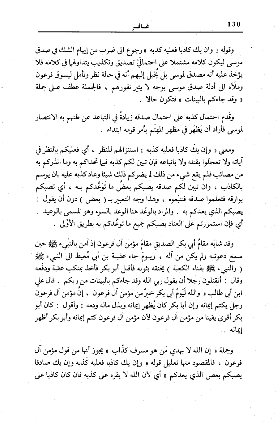 وَقَدْ شَابَهَ مَقَامُ أَبِي بَكْرٍ الصِّدِّيقِ مَقَامَ مُؤْمِنِ آلِ فِرْعَوْنَ إِذْ آمَنَ بِالنَّبِيءِ صَلَّى اللهُ عَلَيْهِ وَسَلَّمَ حِينَ سَمِعَ دَعْوَتَهُ وَلَمْ يَكُنْ مِنْ آلِهِ، وَيَوْمَ جَاءَ عُقْبَةُ بْنُ أَبِي مُعَيْطٍ إِلَى النَّبِيءِ صَلَّى اللهُ عَلَيْهِ وَسَلَّمَ (وَالنَّبِيءُ صَلَّى اللهُ عَلَيْهِ وَسَلَّمَ بِفِنَاءِ الْكَعْبَةِ) يَخْنُقُهُ بِثَوْبِهِ فَأَقْبَلَ أَبُو بَكْرٍ فَأَخَذَ بِمَنْكِبِ عَقَبِةِ وَدَفَعَهُ وَقَالَ: أَتَقْتُلُونَ رَجُلًا أَنْ يَقُولَ رَبِّيَ اللَّهُ وَقَدْ جاءَكُمْ بِالْبَيِّناتِ مِنْ رَبِّكُمْ.