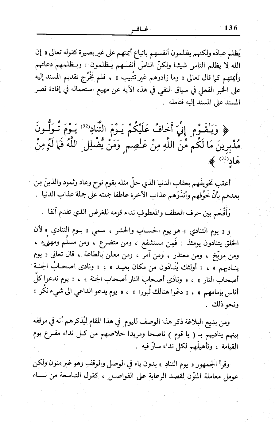 ويَوْمَ التَّنادِ هُوَ يَوْمَ الْحِسَابِ وَالْحَشْرِ، سُمِّيَ يَوْمَ التَّنادِ لِأَنَّ الْخَلْقَ يَتَنَادُونَ يَوْمَئِذٍ: فَمِنْ مُسْتَشْفِعٍ وَمِنْ مُتَضَرِّعٍ وَمن مسلّم ومهنّىء وَمِنْ مُوَبِّخٍ وَمِنْ مُعْتَذِرٍ وَمِنْ آمِرٍ وَمِنْ مُعْلِنٍ بِالطَّاعَةِ قَالَ تَعَالَى: يَوْمَ يُنادِيهِمْ [فصلت: 47] ، أُولئِكَ يُنادَوْنَ مِنْ مَكانٍ بَعِيدٍ [فصلت: