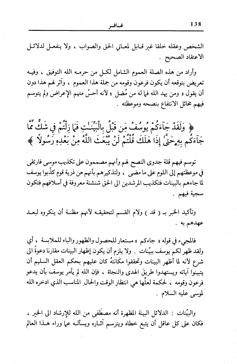 وَلَقَدْ جاءَكُمْ يُوسُفُ مِنْ قَبْلُ بِالْبَيِّناتِ فَما زِلْتُمْ فِي شَكٍّ مِمَّا جاءَكُمْ بِهِ حَتَّى إِذا هَلَكَ قُلْتُمْ لَنْ يَبْعَثَ اللَّهُ مِنْ بَعْدِهِ رَسُولاً كَذلِكَ يُضِلُّ اللَّهُ مَنْ هُوَ مُسْرِفٌ مُرْتابٌ (34) الَّذِينَ يُجادِلُونَ فِي آياتِ اللَّهِ بِغَيْرِ سُلْطانٍ أَتاهُمْ كَبُرَ مَقْتاً عِنْدَ اللَّهِ وَعِنْدَ الَّذِينَ آمَنُوا كَذلِكَ يَطْبَعُ اللَّهُ عَلى كُلِّ قَلْبِ مُتَكَبِّرٍ جَبَّارٍ (35)