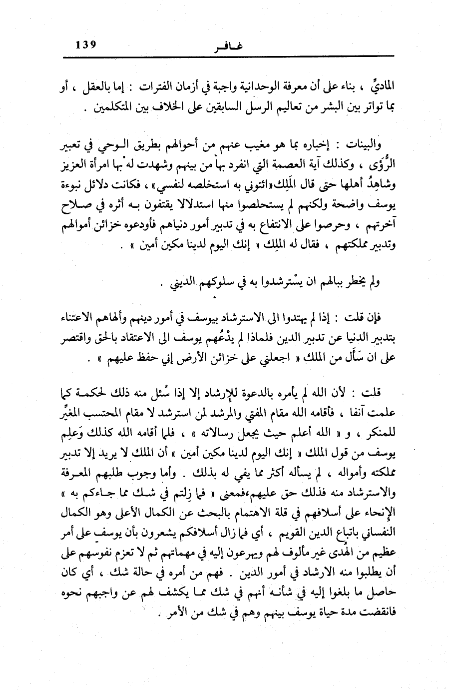 رسالاته [الْأَنْعَام: 124] ، فَلَمَّا أَقَامَهُ اللَّهُ كَذَلِكَ وَعَلِمَ يُوسُفُ مِنْ قَوْلِ الْمَلِكِ: إِنَّكَ الْيَوْمَ لَدَيْنا مَكِينٌ أَمِينٌ [يُوسُف: 54] أَنَّ الْمَلِكَ لَا يُرِيدُ إِلَّا تَدْبِيرَ مَمْلَكَتِهِ وَأَمْوَالِهِ، لَمْ يَسْأَلْهُ أَكْثَرَ مِمَّا يَفِي لَهُ بِذَلِكَ. وَأَمَّا وُجُوبُ طَلَبِهِمُ الْمَعْرِفَةَ وَالِاسْتِرْشَادَ مِنْهُ فَذَلِكَ حَقٌّ عَلَيْهِمْ، فَمَعْنَى: فَما زِلْتُمْ فِي شَكٍّ مِمَّا جاءَكُمْ بِهِ الْإِنْحَاءُ عَلَى أَسْلَافِهِمْ فِي قِلَّةِ الِاهْتِمَامِ بِالْبَحْثِ عَنِ الْكَمَالِ الْأَعْلَى وَهُوَ الْكَمَالُ النَّفْسَانِيُّ بِاتِّبَاعِ الدِّينِ الْقَوِيمِ، أَيْ فَمَا زَالَ أَسْلَافُكُمْ يَشْعُرُونَ بِأَنْ يُوسُفَ عَلَى أَمْرٍ عَظِيمٍ مِنَ الْهُدَى غَيْرِ مَأْلُوفٍ لَهُمْ وَيُهْرَعُونَ إِلَيْهِ فِي مُهِمَّاتِهِمْ ثُمَّ لَا تَعْزِمُ نُفُوسُهُمْ عَلَى أَنْ يَطْلُبُوا مِنْهُ الْإِرْشَادَ فِي أُمُورِ الدِّينِ. فَهُمْ مِنْ أَمْرِهِ فِي حَالَةِ شَكٍّ، أَيْ كَانَ حَاصِلُ مَا بَلَغُوا إِلَيْهِ فِي شَأْنِهِ أَنَّهُمْ فِي شَكٍّ مِمَّا يَكْشِفُ لَهُمْ