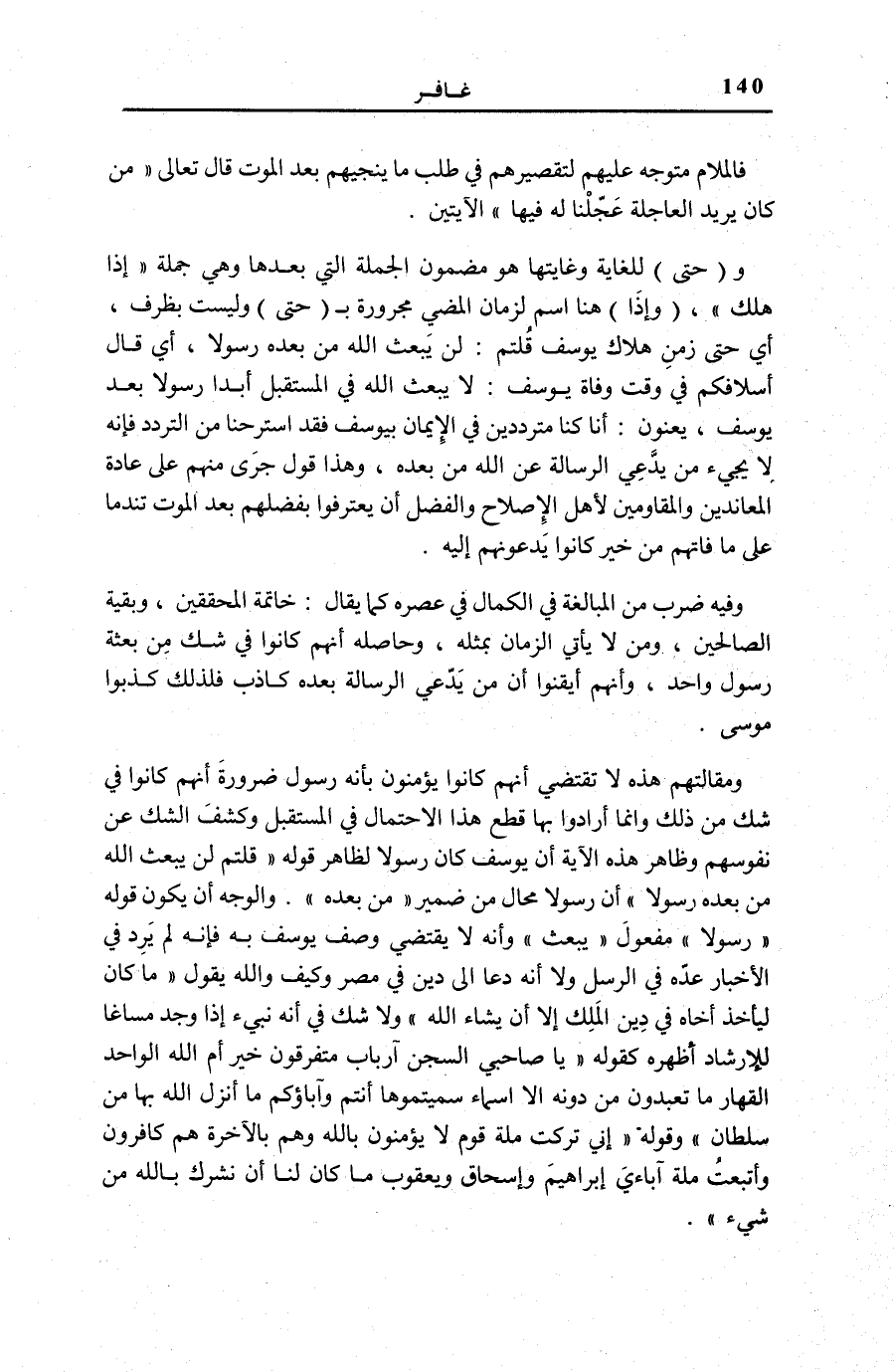 وَمَقَالَتُهُمْ هَذِهِ لَا تَقْتَضِي أَنَّهُمْ كَانُوا يُؤْمِنُونَ بِأَنَّهُ رَسُولٌ ضَرُورَةَ أَنَّهُمْ كَانُوا فِي شَكٍّ مِنْ ذَلِكَ وَإِنَّمَا أَرَادُوا بِهَا قَطْعَ هَذَا الِاحْتِمَالِ فِي الْمُسْتَقْبَلِ وَكَشْفِ الشَّكِّ عَنْ نُفُوسِهِمْ وَظَاهِرُ هَذِهِ الْآيَةِ أَنْ يُوسُفَ كَانَ رَسُولًا لِظَاهِرِ قَوْلِهِ: قُلْتُمْ لَنْ يَبْعَثَ اللَّهُ مِنْ بَعْدِهِ رَسُولًا أَن رَسُولا محَال مِنْ ضَمِيرِ مِنْ بَعْدِهِ. وَالْوَجْهُ أَنْ يَكُونَ قَوْلُهُ: رَسُولًا مَفْعُولَ يَبْعَثَ وَأَنَّهُ لَا يَقْتَضِي وَصْفَ يُوسُفَ بِهِ فَإِنَّهُ لَمْ يَرِدْ فِي الْأَخْبَارِ عَدُّهُ فِي الرُّسُلِ وَلَا أَنَّهُ دَعَا إِلَى دِينٍ فِي مِصْرَ وَكَيْفَ وَاللَّهِ يَقُولُ: مَا كانَ لِيَأْخُذَ أَخاهُ فِي دِينِ الْمَلِكِ إِلَّا أَنْ يَشاءَ اللَّهُ [يُوسُف: 76] وَلَا شَكَّ فِي أَنَّهُ نَبِيءٌ إِذَا وَجَدَ مَسَاغًا لِلْإِرْشَادِ أَظْهَرُهُ كَقَوْلِهِ: يَا صاحِبَيِ السِّجْنِ أَأَرْبابٌ مُتَفَرِّقُونَ خَيْرٌ أَمِ اللَّهُ الْواحِدُ الْقَهَّارُ مَا تَعْبُدُونَ مِنْ دُونِهِ إِلَّا أَسْماءً سَمَّيْتُمُوها أَنْتُمْ وَآباؤُكُمْ مَا أَنْزَلَ اللَّهُ بِها مِنْ سُلْطانٍ [يُوسُف: 39، 40] وَقَوْلُهُ: إِنِّي تَرَكْتُ مِلَّةَ قَوْمٍ لَا يُؤْمِنُونَ بِاللَّهِ وَهُمْ بِالْآخِرَةِ هُمْ كافِرُونَ وَاتَّبَعْتُ مِلَّةَ آبائِي إِبْراهِيمَ وَإِسْحاقَ وَيَعْقُوبَ مَا كانَ لَنا أَنْ نُشْرِكَ بِاللَّهِ مِنْ شَيْءٍ [يُوسُف: 37، 38] .