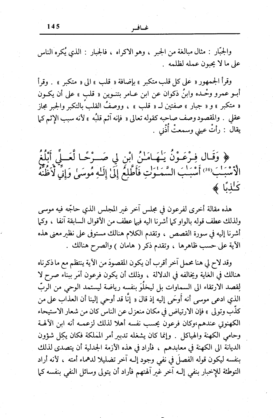 وَقالَ فِرْعَوْنُ يَا هامانُ ابْنِ لِي صَرْحاً لَعَلِّي أَبْلُغُ الْأَسْبابَ (36) أَسْبابَ السَّماواتِ فَأَطَّلِعَ إِلى إِلهِ مُوسى وَإِنِّي لَأَظُنُّهُ كاذِباً وَكَذلِكَ زُيِّنَ لِفِرْعَوْنَ سُوءُ عَمَلِهِ وَصُدَّ عَنِ السَّبِيلِ وَما كَيْدُ فِرْعَوْنَ إِلاَّ فِي تَبابٍ (37)