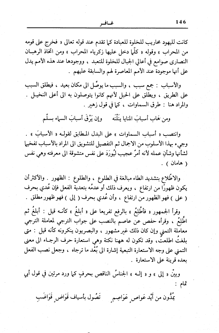 وَقَرَأَ الْجُمْهُورُ: فَأَطَّلِعَ بِالرَّفْعِ تَفْرِيعًا عَلَى أَبْلُغُ كَأَنَّهُ قِيلَ: أَبْلَغُ ثُمَّ أَطْلَعُ، وَقَرَأَهُ حَفْصٌ عَنْ عَاصِمٍ بِالنَّصْبِ عَلَى جَوَابَ التَّرَجِّي لِمُعَامَلَةِ التَّرَجِّي مُعَامَلَةَ التَّمَنِّي وَإِنْ كَانَ ذَلِكَ غَيْرُ مَشْهُورٍ، وَالْبَصْرِيُّونَ يُنْكِرُونَهُ كَأَنَّهُ قِيلَ: مَتَى بَلَغْتُ اطَّلَعْتُ، وَقَدْ تَكُونُ لَهُ هَاهُنَا نُكْتَةٌ وَهِيَ اسْتِعَارَةُ حَرْفِ الرَّجَاءِ إِلَى مَعْنَى التَّمَنِّي عَلَى وَجْهِ الِاسْتِعَارَةِ التَّبَعِيَّةِ إِشَارَةً إِلَى بُعْدِ مَا تَرَجَّاهُ، وَجَعَلَ نَصْبَ الْفِعْلِ بَعْدَهُ قَرِينَةً عَلَى الِاسْتِعَارَةِ.