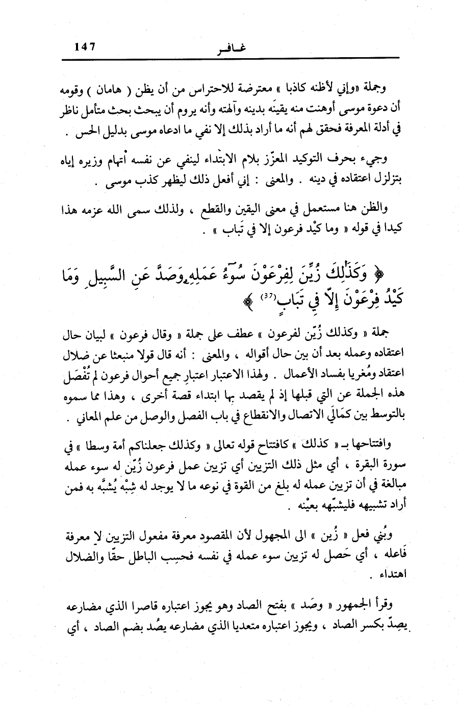 وَكَذلِكَ زُيِّنَ لِفِرْعَوْنَ سُوءُ عَمَلِهِ وَصُدَّ عَنِ السَّبِيلِ وَما كَيْدُ فِرْعَوْنَ إِلَّا فِي تَبابٍ جُمْلَةُ وَكَذلِكَ زُيِّنَ لِفِرْعَوْنَ عَطَفٌ عَلَى جُمْلَةِ وَقالَ فِرْعَوْنُ لِبَيَانِ حَالِ اعْتِقَادِهِ وَعَمَلِهِ بَعْدَ أَنْ بَيَّنَ حَالَ أَقْوَالِهِ، وَالْمَعْنَى: أَنَّهُ قَالَ قَوْلًا مُنْبَعِثًا عَنْ ضَلَالِ اعْتِقَاد ومغريا بِفساد الْأَعْمَالِ. وَلِهَذَا الِاعْتِبَارِ اعْتِبَارُ جَمِيعِ أَحْوَالِ فِرْعَوْنَ لَمْ تُفْصَلْ هَذِهِ الْجُمْلَةُ عَنِ الَّتِي قَبْلَهَا إِذْ لَمْ يُقْصَدْ بِهَا ابْتِدَاءُ قِصَّةٍ أُخْرَى، وَهَذَا مِمَّا سَمَّوْهُ بِالتَّوَسُّطِ بَيْنَ كَمَالِيِّ الِاتِّصَالِ وَالِانْقِطَاعِ فِي بَابِ الْفَصْلِ وَالْوَصْلِ مِنْ عِلْمِ الْمَعَانِي. وَافْتِتَاحُهَا بِ كَذلِكَ كَافْتِتَاحِ قَوْلِهِ تَعَالَى: وَكَذلِكَ جَعَلْناكُمْ أُمَّةً وَسَطاً فِي سُورَةِ الْبَقَرَةِ [143] ، أَيْ مِثْلَ ذَلِكَ التَّزْيِينِ أَي تَزْيِين عَمَلِ فِرْعَوْنَ زُيِّنَ لَهُ سُوءُ عَمَلِهِ مُبَالَغَةً فِي أَنَّ تَزْيِينَ عَمَلِهِ لَهُ بَلَغَ مِنَ الْقُوَّةِ فِي نَوْعِهِ مَا لَا يُوجَدُ لَهُ شِبْهٌ يُشَبَّهُ بِهِ فَمَنْ أَرَادَ تَشْبِيهَهُ فَلْيُشَبِّهْهُ بِعَيْنِهِ.
