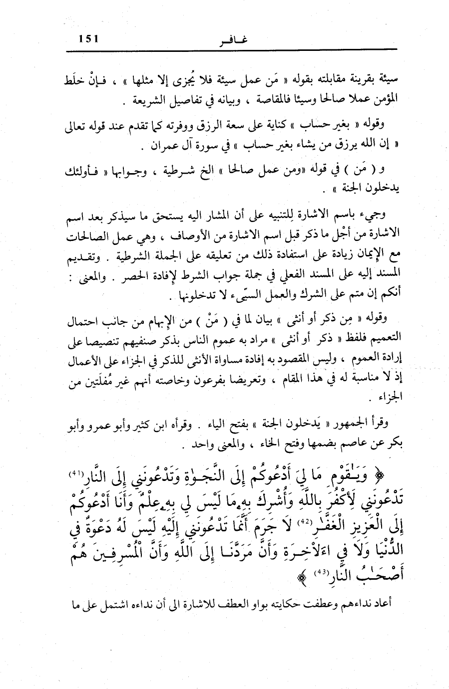وَيا قَوْمِ مَا لِي أَدْعُوكُمْ إِلَى النَّجاةِ وَتَدْعُونَنِي إِلَى النَّارِ (41) تَدْعُونَنِي لِأَكْفُرَ بِاللَّهِ وَأُشْرِكَ بِهِ مَا لَيْسَ لِي بِهِ عِلْمٌ وَأَنَا أَدْعُوكُمْ إِلَى الْعَزِيزِ الْغَفَّارِ (42) لَا جَرَمَ أَنَّما تَدْعُونَنِي إِلَيْهِ لَيْسَ لَهُ دَعْوَةٌ فِي الدُّنْيا وَلا فِي الْآخِرَةِ وَأَنَّ مَرَدَّنا إِلَى اللَّهِ وَأَنَّ الْمُسْرِفِينَ هُمْ أَصْحابُ النَّارِ (43)