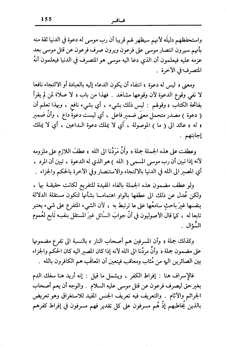 وَعُطِفَتْ عَلَى هَذِهِ الْجُمْلَةِ جُمْلَةُ وَأَنَّ مَرَدَّنا إِلَى اللَّهِ عَطْفَ اللَّازِمِ عَلَى ملزومه لِأَنَّهُ إِذا تَبَيَّنَ أَنَّ رَبَّ مُوسَى الْمُسَمَّى (اللَّهَ) هُوَ الَّذِي لَهُ الدَّعْوَةُ، تَبَيَّنَ أَنَّ الْمَرَدَّ أَيْ الْمَصِيرَ إِلَى اللَّهِ فِي الدُّنْيَا بِالِالْتِجَاءِ وَالِاسْتِنْصَارِ وَفِي الْآخِرَةِ بِالْحُكْمِ وَالْجَزَاءِ. وَلَوْ عُطِفَ مَضْمُونُ هَذِهِ الْجُمْلَةِ بِالْفَاءِ الْمُفِيدَةِ لِلتَّفْرِيعِ لَكَانَتْ حَقِيقَةٌ بِهَا، وَلَكِنْ عُدِلَ عَنْ ذَلِكَ إِلَى عَطْفِهَا بِالْوَاوِ اهْتِمَامًا بِشَأْنِهَا لِتَكُونَ مُسْتَقِلَّةَ الدَّلَالَةِ بِنَفْسِهَا غَيْرَ بَاحِثٍ سَامِعُهَا عَلَى مَا تَرْتَبِطُ بِهِ، لِأَنَّ