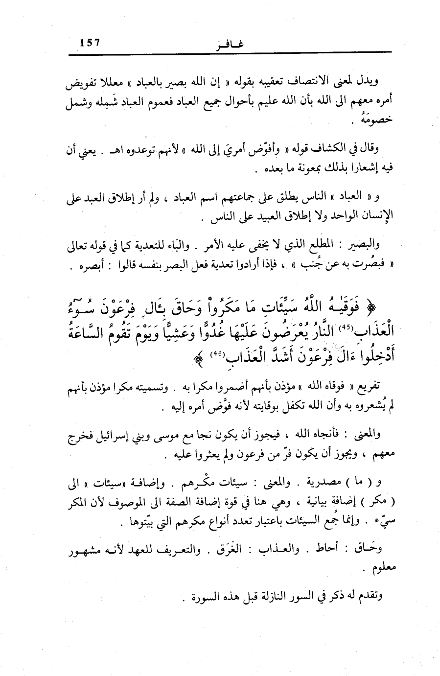 فَوَقاهُ اللَّهُ سَيِّئاتِ مَا مَكَرُوا وَحاقَ بِآلِ فِرْعَوْنَ سُوءُ الْعَذابِ (45) النَّارُ يُعْرَضُونَ عَلَيْها غُدُوًّا وَعَشِيًّا وَيَوْمَ تَقُومُ السَّاعَةُ أَدْخِلُوا آلَ فِرْعَوْنَ أَشَدَّ الْعَذابِ (46)