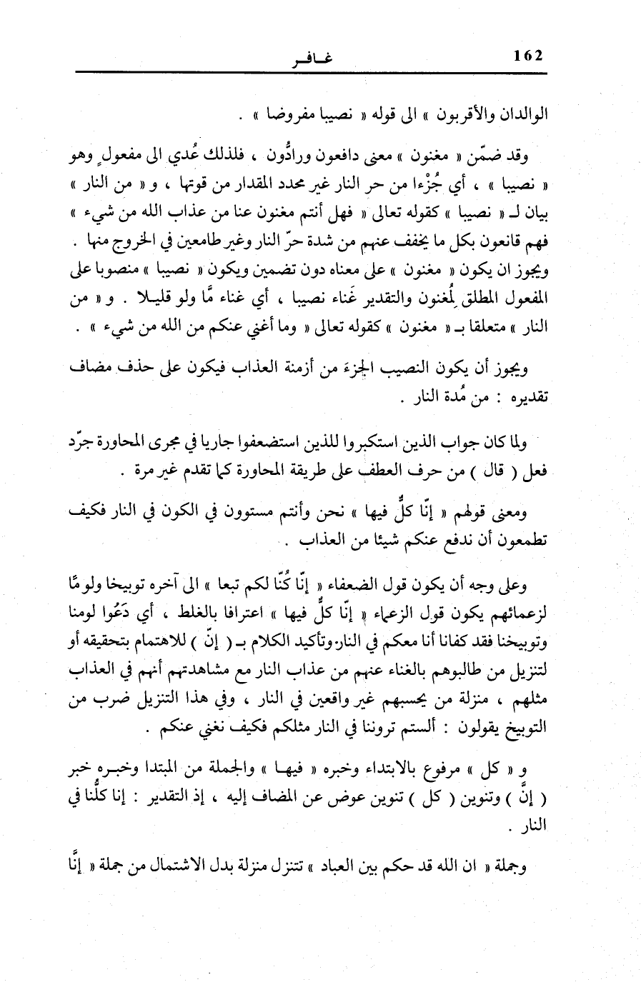 وَقَدْ ضُمِّنَ مُغْنُونَ مَعْنَى دَافِعُونَ وَرَادُّونَ، فَلِذَلِكَ عُدِّيَ إِلَى مَفْعُولٍ وَهُوَ نَصِيباً أَيْ جُزْءًا مِنْ حَرِّ النَّارِ غَيْرَ مُحَدَّدِ الْمِقْدَارِ مِنْ قُوَّتِهَا، ومِنَ النَّارِ بَيَانٌ لِ نَصِيباً كَقَوْلِهِ تَعَالَى: فَهَلْ أَنْتُمْ مُغْنُونَ عَنَّا مِنْ عَذابِ اللَّهِ مِنْ شَيْءٍ [إِبْرَاهِيم: 21] فَهُمْ قَانِعُونَ بِكُلِّ مَا يُخَفِّفُ عَنْهُمْ مِنْ شِدَّةِ حَرِّ النَّارِ وَغَيْرُ طَامِعِينَ فِي الْخُرُوجِ مِنْهَا. وَيَجُوزُ أَنْ يَكُونَ مُغْنُونَ عَلَى مَعْنَاهُ دُونَ تَضْمِينٍ وَيَكُونَ نَصِيباً مَنْصُوبًا عَلَى الْمَفْعُول الْمُطلق لمغنون وَالتَّقْدِيرُ غَنَّاءً نَصِيبًا، أَيْ غِنَاءً مَا وَلَوْ قَلِيلًا. ومِنَ النَّارِ مُتَعَلِّقًا بِ مُغْنُونَ كَقَوْلِهِ تَعَالَى: وَما أُغْنِي عَنْكُمْ مِنَ اللَّهِ مِنْ شَيْءٍ [يُوسُف: 67] . وَيَجُوزُ أَنْ يَكُونَ النَّصِيبُ الْجُزْءَ مِنْ أَزْمِنَةِ الْعَذَابِ فَيَكُونُ عَلَى حَذْفِ مُضَافٍ تَقْدِيرُهُ: مِنْ مُدَّةِ النَّارِ.