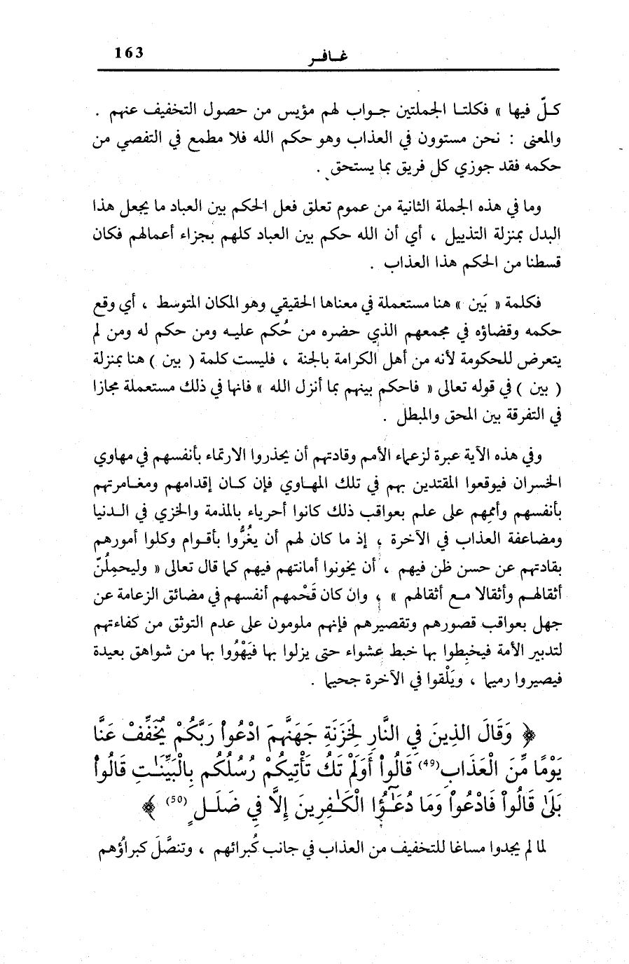 وَقالَ الَّذِينَ فِي النَّارِ لِخَزَنَةِ جَهَنَّمَ ادْعُوا رَبَّكُمْ يُخَفِّفْ عَنَّا يَوْماً مِنَ الْعَذابِ (49) قالُوا أَوَلَمْ تَكُ تَأْتِيكُمْ رُسُلُكُمْ بِالْبَيِّناتِ قالُوا بَلى قالُوا فَادْعُوا وَما دُعاءُ الْكافِرِينَ إِلاَّ فِي ضَلالٍ (50)