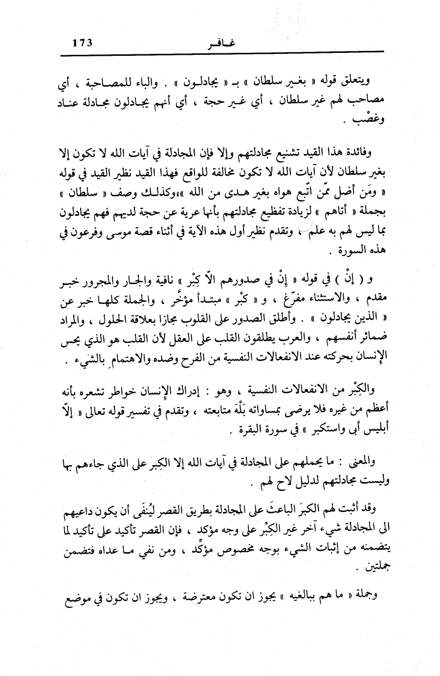 وإِنَّ فِي قَوْلِهِ: إِنْ فِي صُدُورِهِمْ إِلَّا كِبْرٌ نَافِيَةٌ وَالْجَارُّ وَالْمَجْرُورُ خَبَرٌ مُقَدَّمٌ، وَالِاسْتِثْنَاءُ مُفَرَّغٌ، وكِبْرٌ مُبْتَدَأٌ مُؤَخَّرٌ، وَالْجُمْلَةُ كُلُّهَا خَبَرٌ عَنِ الَّذِينَ يُجادِلُونَ. وَأَطْلَقَ الصُّدُورَ عَلَى الْقُلُوبِ مَجَازًا بِعَلَاقَةِ الْحُلُولِ، وَالْمُرَادُ ضَمَائِرُ أَنْفُسِهِمْ، وَالْعَرَبُ يُطْلِقُونَ الْقَلْبَ عَلَى الْعَقْلِ لِأَنَّ الْقَلْبَ هُوَ الَّذِي يُحِسُّ الْإِنْسَانُ بِحَرَكَتِهِ عِنْدَ الِانْفِعَالَاتِ النَّفْسِيَّةِ مِنَ الْفَرَحِ وَضِدِّهِ وَالِاهْتِمَامِ بِالشَّيْءِ. وَالْكِبْرُ مِنَ الِانْفِعَالَاتِ النَّفْسِيَّةِ، وَهُوَ: إِدْرَاكُ الْإِنْسَانِ