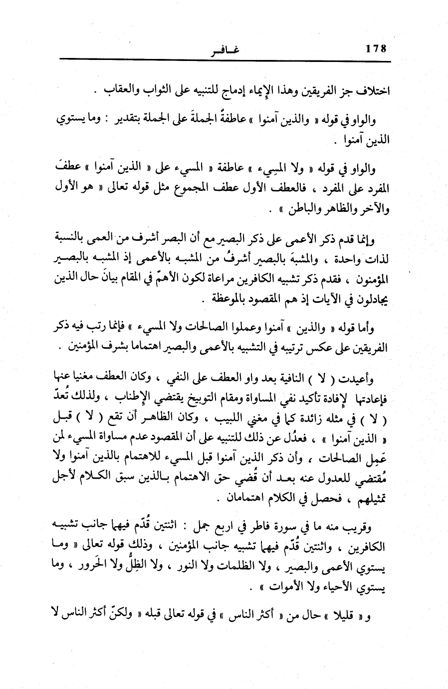 وَأَمَّا قَوْلُهُ: وَالَّذِينَ آمَنُوا وَعَمِلُوا الصَّالِحاتِ وَلَا الْمُسِيءُ فَإِنَّمَا رَتَّبَ فِيهِ ذِكْرَ الْفَرِيقَيْنِ عَلَى عَكْسِ تَرْتِيبِهِ فِي التَّشْبِيهِ بِالْأَعْمَى وَالْبَصِيرِ اهْتِمَامًا بِشَرَفِ الْمُؤْمِنِينَ.