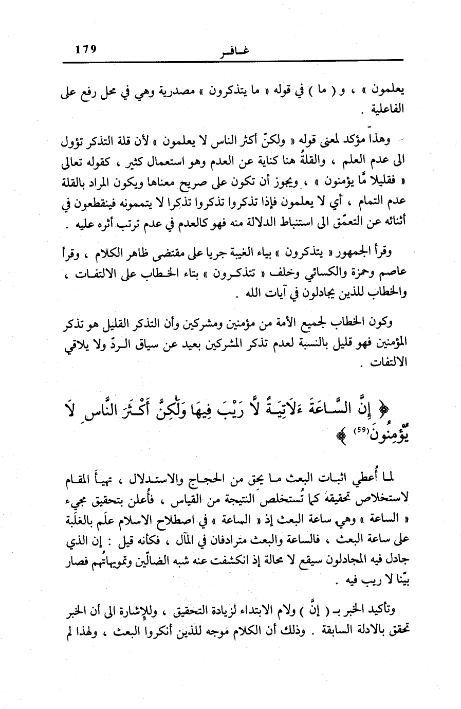 إِنَّ السَّاعَةَ لَآتِيَةٌ لَا رَيْبَ فِيها وَلكِنَّ أَكْثَرَ النَّاسِ لَا يُؤْمِنُونَ (59)