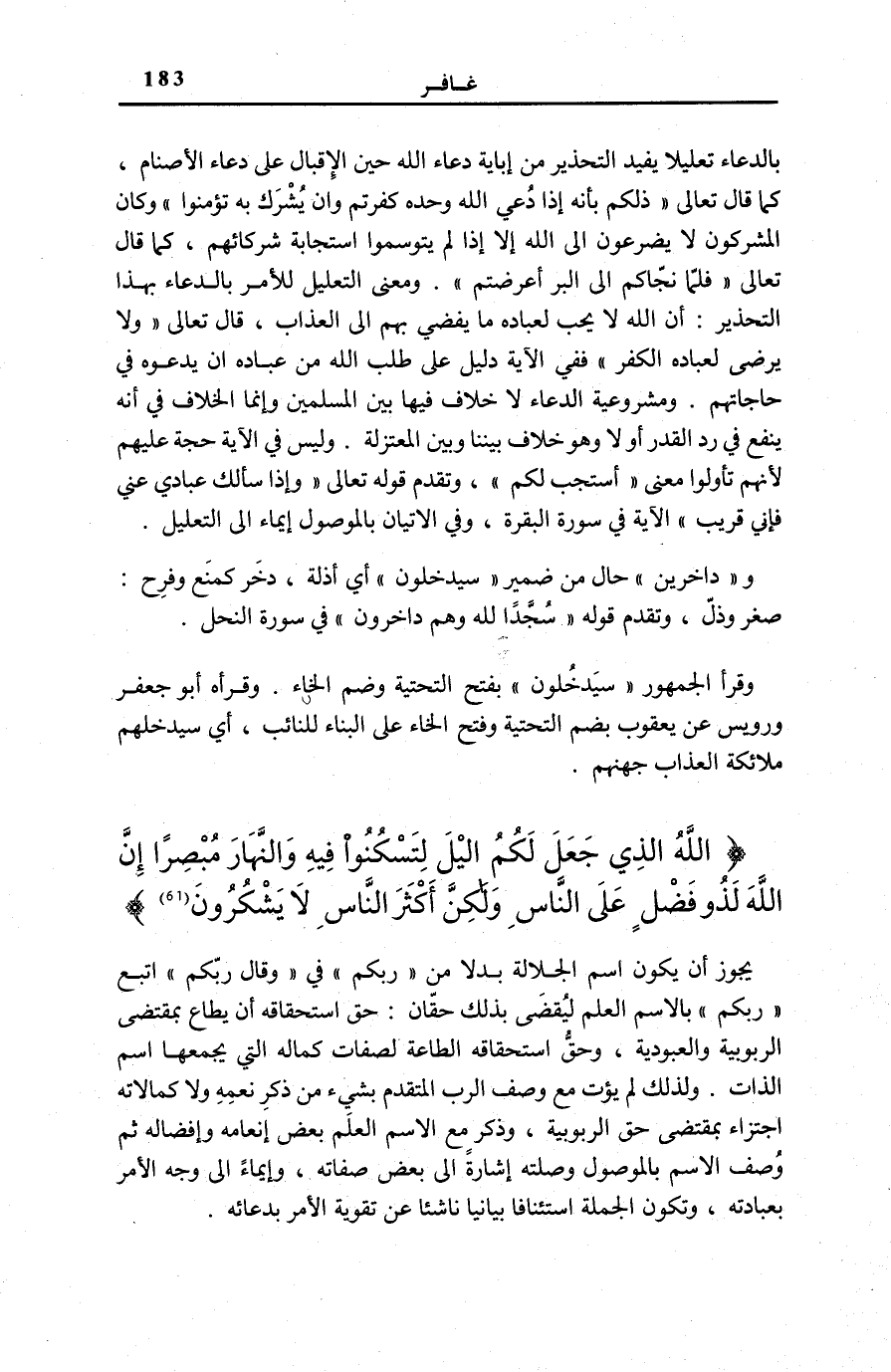 الْقَدَرِ أَوْ لَا؟ وَهُوَ خِلَافٌ بَيْنَنَا وَبَيْنَ الْمُعْتَزِلَةِ. وَلَيْسَ فِي الْآيَةِ حُجَّةٌ عَلَيْهِمْ لِأَنَّهُمْ تَأَوَّلُوا مَعْنَى أَسْتَجِبْ لَكُمْ، وَتَقَدَّمَ قَوْلُهُ تَعَالَى: وَإِذا سَأَلَكَ عِبادِي عَنِّي فَإِنِّي قَرِيبٌ الْآيَةَ فِي سُورَةِ الْبَقَرَةِ [186] ، وَفِي الْإِتْيَانِ بِالْمَوْصُولِ إِيمَاءٌ إِلَى التَّعْلِيلِ.