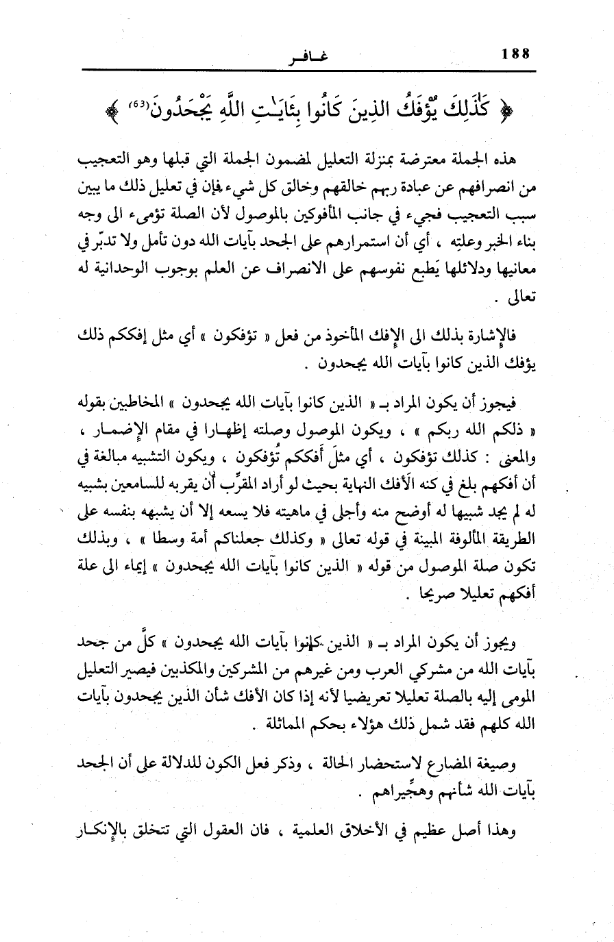 ذلِكُمُ اللَّهُ رَبُّكُمْ [غَافِر: 62] ، وَيَكُونُ الْمَوْصُولُ وَصِلَتُهُ إِظْهَارًا فِي مَقَامِ الْإِضْمَارِ، وَالْمَعْنَى: كَذَلِكَ تُؤْفَكُونَ، أَيْ مِثْلُ إِفْكِكُمْ تُؤْفَكُونَ، وَيَكُونُ التَّشْبِيهُ مُبَالَغَةً فِي أَنَّ إِفْكَهُمْ بَلَغَ فِي كُنْهِ الْإِفْكِ النِّهَايَةَ بِحَيْثُ لَوْ أَرَادَ الْمُقَرِّبُ أَنْ يُقَرِّبَهُ لِلسَّامِعِينَ بِشَبِيهٍ لَهُ لَمْ يَجِدْ شَبِيهًا لَهُ أَوْضَحَ مِنْهُ وَأَجْلَى فِي مَاهِيَّتِهِ فَلَا يَسَعُهُ إِلَّا أَنْ يُشَبِّهَهُ بِنَفْسِهِ عَلَى الطَّرِيقَةِ الْمَأْلُوفَةِ الْمُبَيَّنَةِ فِي قَوْلِهِ تَعَالَى: وَكَذلِكَ جَعَلْناكُمْ أُمَّةً وَسَطاً [الْبَقَرَة: 143] ، وَبِذَلِكَ تَكُونُ صِلَةُ الْمَوْصُولِ مِنْ قَوْلِهِ: الَّذِينَ كانُوا بِآياتِ اللَّهِ يَجْحَدُونَ إِيمَاءً إِلَى عِلَّةِ إِفْكِهِمْ تَعْلِيلًا صَرِيحًا.