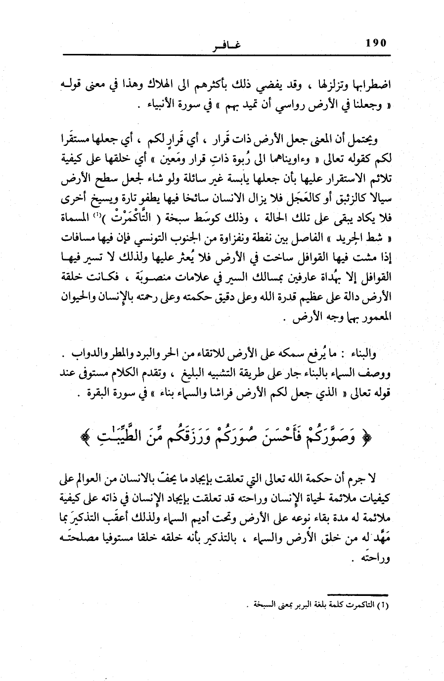 وَيُحْتَمَلُ أَنَّ الْمَعْنَى جَعَلَ الْأَرْضَ ذَاتَ قَرَارٍ، أَيْ قَرَارٍ لَكُمْ، أَيْ جَعَلَهَا مُسْتَقَرًّا لَكُمْ كَقَوْلِهِ تَعَالَى: وَآوَيْناهُما إِلى رَبْوَةٍ ذاتِ قَرارٍ وَمَعِينٍ [الْمُؤْمِنُونَ: 50] أَيْ خَلَقَهَا عَلَى كَيْفِيَّةٍ تُلَائِمُ الِاسْتِقْرَارَ عَلَيْهَا بِأَنْ جَعَلَهَا يَابِسَةً غَيْرَ سَائِلَةٍ وَلَوْ شَاءَ لَجَعَلَ سَطْحَ الْأَرْضِ سَيَّالًا كَالزِّئْبَقِ أَوْ كَالْعَجَلِ فَلَا يَزَالُ الْإِنْسَانُ سَائِخًا فِيهَا يَطْفُو تَارَةً وَيَسِيخُ أُخْرَى فَلَا يَكَادُ يَبْقَى عَلَى تِلْكَ الْحَالَةِ، وَذَلِكَ كَوَسَطِ سَبْخَةِ (التاكمرت) (¬1) الْمُسَمَّاةِ: «شَطَّ الْجَرِيدِ» الْفَاصِلَ بَين «نفطة» و «نفزاوة» مِنَ الْجَنُوبِ التُّونُسِيِّ فَإِنَّ فِيهَا مَسَافَاتٍ إِذَا مَشَتْ فِيهَا الْقَوَافِلُ سَاخَتْ فِي الْأَرْضِ فَلَا يُعْثَرُ عَلَيْهَا، وَلِذَلِكَ لَا تَسِيرُ فِيهَا الْقَوَافِلُ إِلَّا بِهُدَاةٍ عَارِفِينَ بِمَسَالِكِ السَّيْرِ فِي عَلَامَاتٍ مَنْصُوبَةٍ، فَكَانَتْ خِلْقَةُ الْأَرْضِ دَالَّةً عَلَى عَظِيمِ قُدْرَةِ اللَّهِ وَعَلَى دَقِيقِ حِكْمَتِهِ وَعَلَى رَحْمَتِهِ بِالْإِنْسَانِ وَالْحَيَوَانِ الْمَعْمُورِ بِهِمَا وَجْهُ الْأَرْضِ.