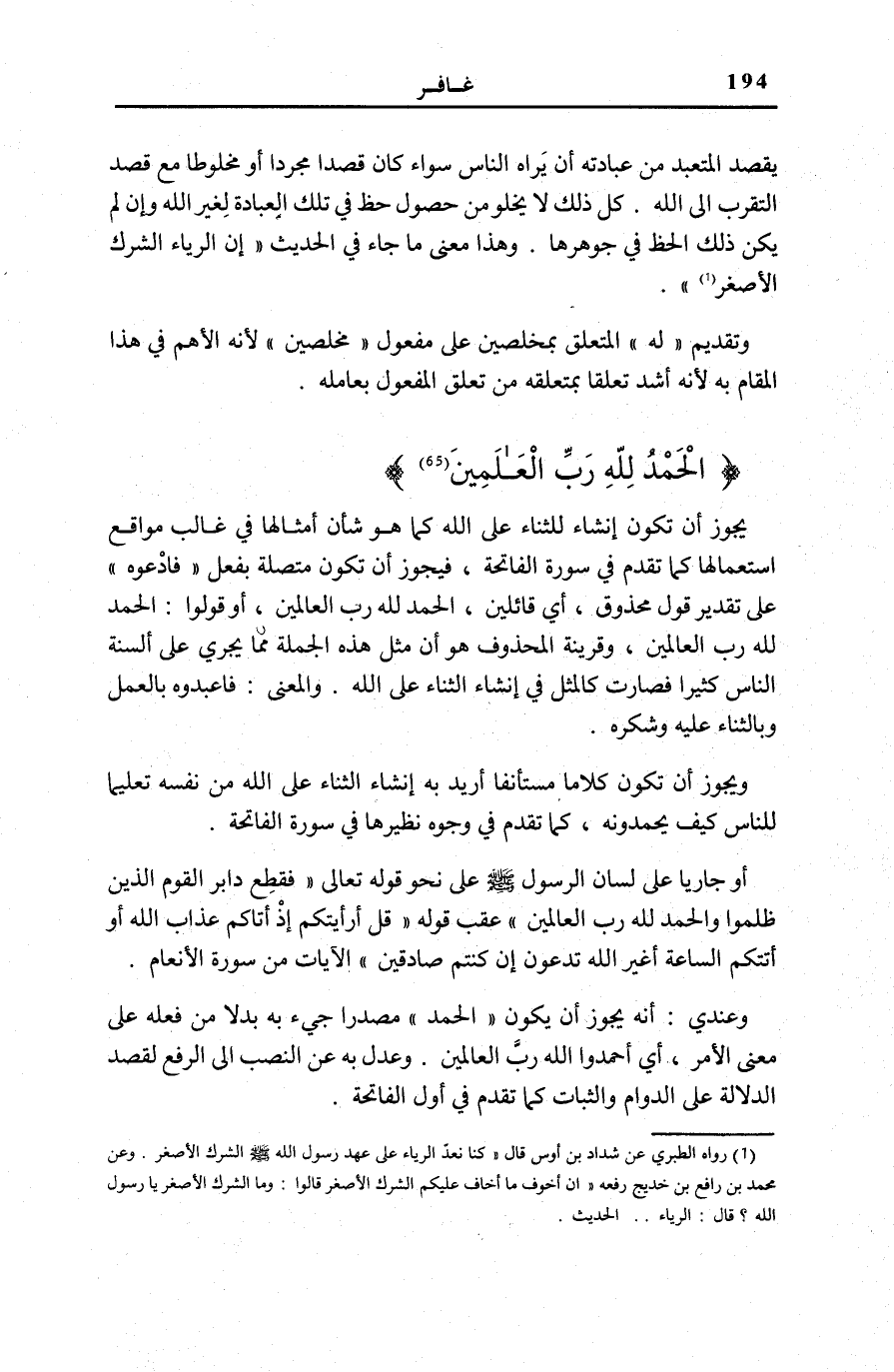 (¬1) رَوَاهُ الطَّبَرِيّ عَن شَدَّاد بن أَوْس قَالَ: «كُنَّا نعدّ الرِّيَاء على عهد رَسُول الله صَلَّى اللهُ عَلَيْهِ وَسَلَّمَ الشّرك الْأَصْغَر.
