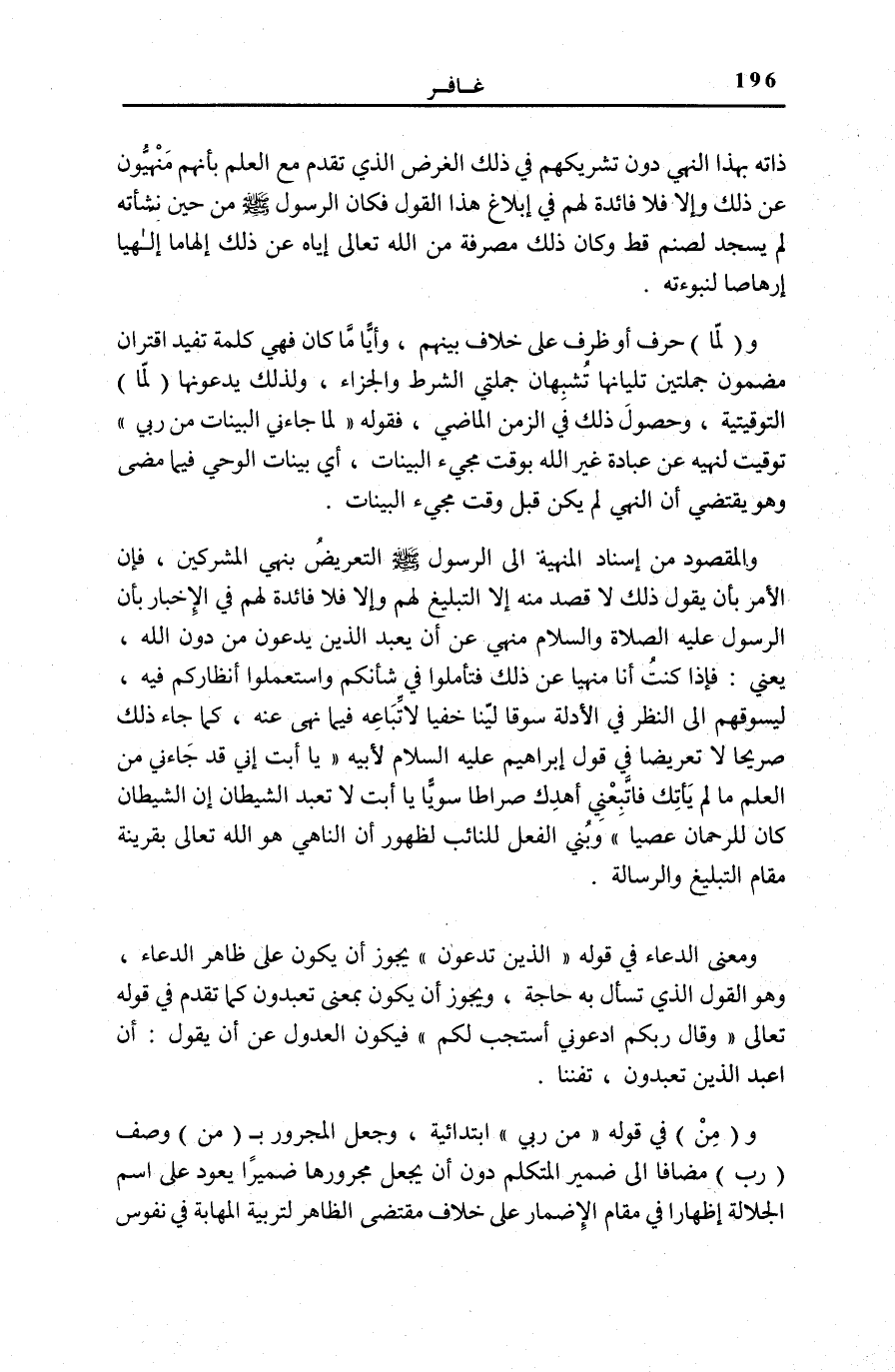 وَقالَ رَبُّكُمُ ادْعُونِي أَسْتَجِبْ لَكُمْ [غَافِر: 60] فَيَكُونُ الْعُدُولُ عَنْ أَنْ يَقُولَ: أَنْ أَعْبُدَ الَّذِينَ تَعْبُدُونَ، تَفَنُّنَا. وَ (مِنْ) فِي قَوْلِهِ: مِنْ رَبِّي ابْتِدَائِيَّةٌ، وَجُعِلَ الْمَجْرُورُ بِ (مِنْ) وَصْفَ (رَبٍّ) مُضَافًا إِلَى ضَمِيرِ الْمُتَكَلِّمِ دُونَ أَنْ يُجْعَلَ مَجْرُورُهَا ضَمِيرًا يَعُودُ عَلَى اسْمِ الْجَلَالَةِ إِظْهَارًا فِي مَقَامِ الْإِضْمَارِ عَلَى خِلَافِ مُقْتَضَى الظَّاهِرِ لِتَرْبِيَةِ الْمَهَابَةِ فِي نُفُوسِ