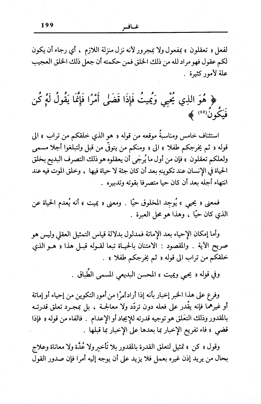 هُوَ الَّذِي يُحْيِي وَيُمِيتُ فَإِذا قَضى أَمْراً فَإِنَّما يَقُولُ لَهُ كُنْ فَيَكُونُ (68)