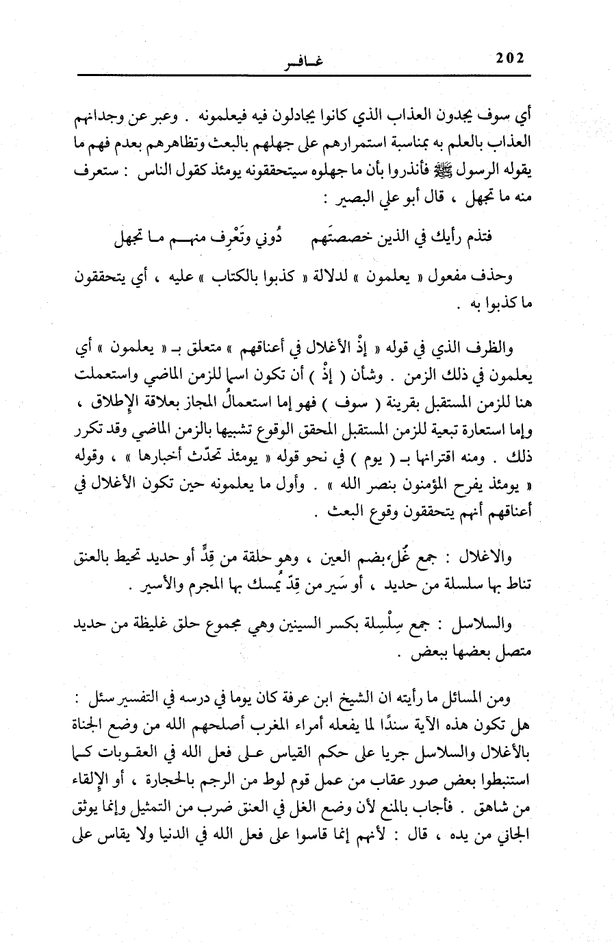 وَالظَّرْفُ الَّذِي فِي قَوْلِهِ: إِذِ الْأَغْلالُ فِي أَعْناقِهِمْ مُتَعَلِّقٌ بِ يَعْلَمُونَ أَيْ يَعْلَمُونَ فِي ذَلِكَ الزَّمَنِ. وَشَأْنُ (إِذْ) أَنْ تَكُونَ اسْمًا لِلزَّمَنِ الْمَاضِي وَاسْتُعْمِلَتْ هُنَا لِلزَّمَنِ الْمُسْتَقْبَلِ بِقَرِينَةِ (سَوْفَ) فَهُوَ إِمَّا اسْتِعْمَالُ الْمَجَازِ بِعَلَاقَةِ الْإِطْلَاقِ، وَإِمَّا اسْتِعَارَةٌ تَبَعِيَّةٌ لِلزَّمَنِ الْمُسْتَقْبَلِ الْمُحَقَّقِ الْوُقُوعِ تَشْبِيهًا بِالزَّمَنِ الْمَاضِي وَقَدْ تَكَرَّرَ ذَلِكَ. وَمِنْهُ اقْتِرَانُهَا بِ (يَوْمَ) فِي نَحْوِ قَوْلِهِ: