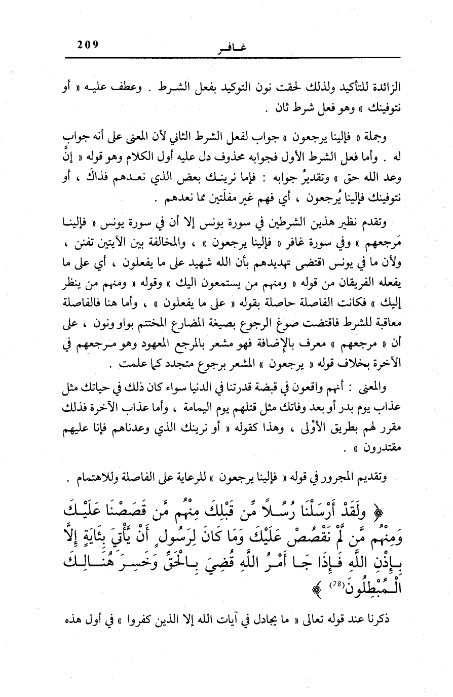 وَتَقَدَّمَ نَظِيرُ هَذَيْنِ الشَّرْطَيْنِ فِي سُورَةِ يُونُسَ إِلَّا أَنَّ فِي سُورَةِ يُونُسَ [46] فَإِلَيْنا مَرْجِعُهُمْ وَفِي سُورَةِ غَافِرٍ فَإِلَيْنا يُرْجَعُونَ، وَالْمُخَالَفَةُ بَيْنَ الْآيَتَيْنِ تَفَنُّنٌ، وَلِأَنَّ مَا فِي يُونُسَ اقْتَضَى تَهْدِيدَهُمْ بِأَنَّ اللَّهَ شَهِيدٌ عَلَى مَا يَفْعَلُونَ، أَيْ عَلَى مَا يَفْعَلُهُ الْفَرِيقَانِ مِنْ قَوْلِهِ: