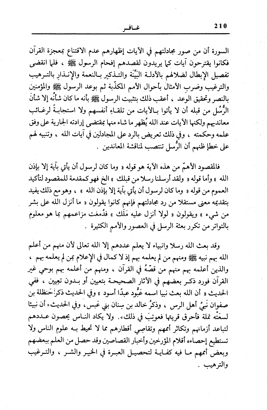 وَقَدْ بَعَثَ اللَّهُ رُسُلًا وَأَنْبِيَاءَ لَا يَعْلَمُ عَدَدَهُمْ إِلَّا اللَّهُ تَعَالَى لِأَنَّ مِنْهُمْ مَنْ أَعْلَمَ الله بهم نبيه صَلَّى اللهُ عَلَيْهِ وَسَلَّمَ وَمِنْهُمْ مَنْ لَمْ يُعْلِمْهُ بِهِمْ إِذْ لَا كَمَالَ فِي الْإِعْلَامِ بِمَنْ لَمْ يُعْلِمْهُ بِهِمْ، وَالَّذِينَ أَعْلَمَهُ بِهِمْ مِنْهُمْ مَنْ قَصَّهُ فِي الْقُرْآنِ، وَمِنْهُمْ مَنْ أَعْلَمَهُ بِهِمْ بِوَحْيٍ غَيْرِ الْقُرْآنِ فَوَرَدَ ذِكْرُ بَعْضِهِمْ فِي الْآثَارِ الصَّحِيحَةِ بِتَعْيِينٍ أَوْ بِدُونِ تَعْيِينٍ،