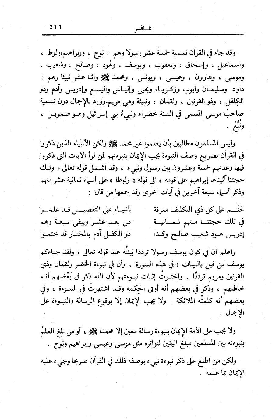 وَلَا يَجِبُ عَلَى الْأُمَّةِ الْإِيمَانُ بِنُبُوءَةِ رِسَالَةِ مُعَيَّنٍ إِلَّا مُحَمَّدًا صَلَّى اللهُ عَلَيْهِ وَسَلَّمَ، أَوْ مَنْ بَلَغَ الْعِلْمُ بِنُبُوءَتِهِ بَيْنَ الْمُسْلِمِينَ مَبْلَغَ الْيَقِينِ لِتَوَاتُرِهِ مِثْلَ مُوسَى وَعِيسَى وَإِبْرَاهِيمَ وَنُوحٍ.
