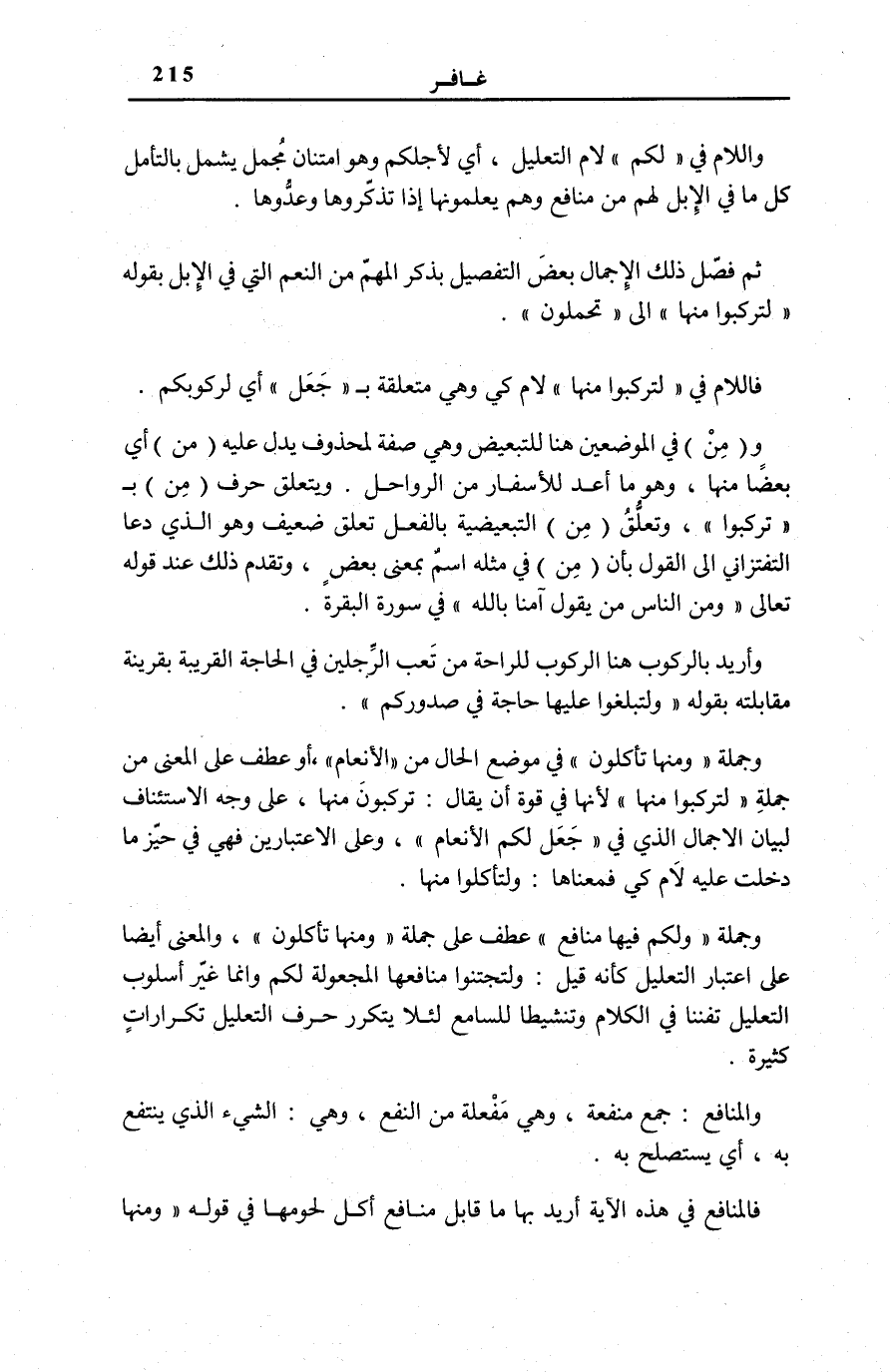 وَاللَّامُ فِي لَكُمْ لَامُ التَّعْلِيلِ، أَيْ لِأَجْلِكُمْ وَهُوَ امْتِنَانٌ مُجْمَلٌ يَشْمَلُ بِالتَّأَمُّلِ كُلَّ مَا فِي الْإِبِلِ لَهُمْ مِنْ مَنَافِعَ وَهُمْ يَعْلَمُونَهَا إِذَا تَذَكَّرُوهَا وَعَدُّوهَا. ثُمَّ فَصَّلَ ذَلِكَ الْإِجْمَالَ بَعْضَ التَّفْصِيلِ بِذِكْرِ الْمُهِمِّ مِنَ النِّعَمِ الَّتِي فِي الْإِبِلِ بِقَوْلِهِ: لِتَرْكَبُوا مِنْها إِلَى تُحْمَلُونَ.