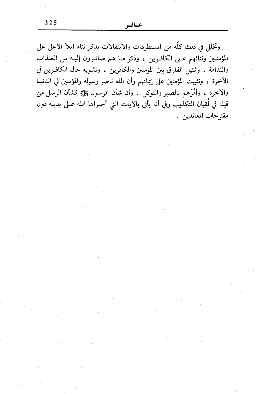 وَتَخَلَّلَ فِي ذَلِكَ كُلِّهِ مِنَ الْمُسْتَطْرَدَاتِ وَالِانْتِقَالَاتِ بِذِكْرِ ثَنَاءِ الْمَلَأِ الْأَعْلَى عَلَى الْمُؤْمِنِينَ وَثَنَائِهِمْ عَلَى الْكَافِرِينَ، وَذِكْرِ مَا هُمْ صَائِرُونَ إِلَيْهِ مِنَ الْعَذَابِ وَالنَّدَامَةِ، وَتَمْثِيلِ الْفَارِقِ بَيْنَ الْمُؤْمِنِينَ وَالْكَافِرِينَ، وَتَشْوِيهِ حَالِ الْكَافِرِينَ فِي الْآخِرَةِ، وَتَثْبِيتِ الْمُؤْمِنِينَ عَلَى إِيمَانِهِمْ وَأَنَّ اللَّهَ نَاصِرٌ رَسُولَهُ وَالْمُؤْمِنِينَ فِي الدُّنْيَا وَالْآخِرَةِ، وَأَمْرِهِمْ بِالصَّبْرِ وَالتَّوَكُّلِ، وَأَنَّ شَأْنَ الرَّسُولِ صَلَّى اللهُ عَلَيْهِ وَسَلَّمَ كَشَأْنِ الرُّسُلِ مِنْ قَبْلِهِ فِي لُقْيَانِ التَّكْذِيبِ وَفِي أَنَّهُ يَأْتِي بِالْآيَاتِ الَّتِي أَجْرَاهَا اللَّهُ عَلَى يَدَيْهِ دُونَ مُقْتَرَحَاتِ الْمُعَانِدِينَ.
