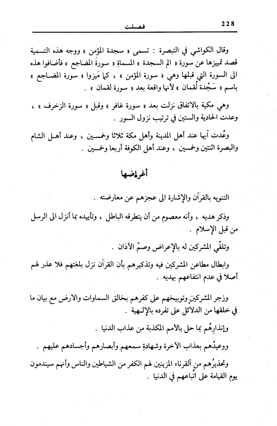 وَهِيَ مَكِّيَّةٌ بِالِاتِّفَاقِ نَزَلَتْ بَعْدَ سُورَةِ غَافِرٍ وَقبل سُورَةِ الزُّخْرُفِ، وَعُدَّتِ الْحَادِيَةَ وَالسِتِّينَ فِي تَرْتِيبِ نُزُولِ السُّوَرِ. وَعُدَّتْ آيُهَا عِنْدَ أَهْلِ الْمَدِينَةِ وَأَهْلِ مَكَّةَ ثَلَاثًا وَخَمْسِينَ، وَعِنْدَ أَهْلِ الشَّامِ وَالْبَصْرَةِ اثْنَتَيْنِ وَخَمْسِينَ، وَعِنْدَ أَهْلِ الْكُوفَةِ أَرْبَعًا وَخَمْسِينَ.