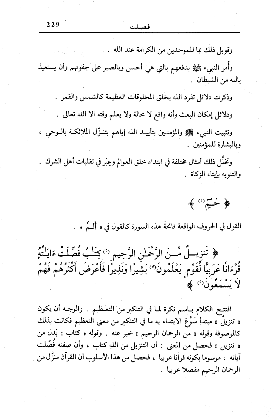 تَنْزِيلٌ مِنَ الرَّحْمنِ الرَّحِيمِ (2) كِتابٌ فُصِّلَتْ آياتُهُ قُرْآناً عَرَبِيًّا لِقَوْمٍ يَعْلَمُونَ (3) بَشِيراً وَنَذِيراً فَأَعْرَضَ أَكْثَرُهُمْ فَهُمْ لَا يَسْمَعُونَ (4)