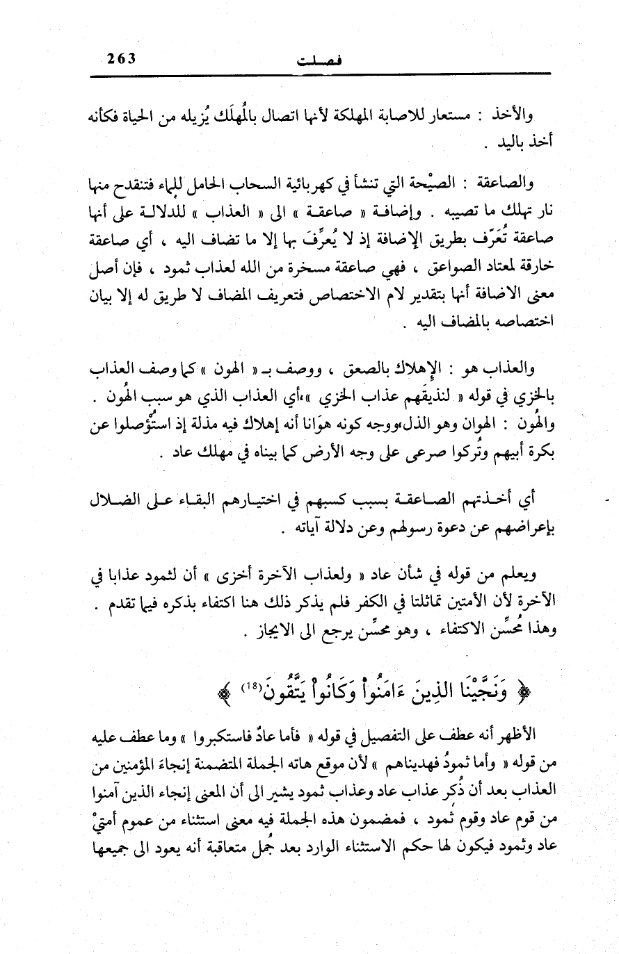 وَالصَّاعِقَةُ: الصَّيْحَةُ الَّتِي تَنْشَأُ فِي كَهْرَبَائِيَّةِ السَّحَابِ الْحَامِلِ لِلْمَاءِ فَتَنْقَدِحُ مِنْهَا نَارٌ تُهْلِكُ مَا تُصِيبُهُ. وَإِضَافَةُ صاعِقَةُ إِلَى الْعَذابِ لِلدَّلَالَةِ عَلَى أَنَّهَا صَاعِقَةٌ تُعَرَّفُ بِطَرِيقِ الْإِضَافَةِ إِذْ لَا يُعَرَّفُ بِهَا إِلَّا مَا تُضَافُ إِلَيْهِ، أَيْ صَاعِقَةٌ خَارِقَةٌ لِمُعْتَادِ الصَّوَاعِقِ، فَهِيَ صَاعِقَةٌ مُسَخَّرَةٌ مِنَ اللَّهِ لِعَذَابِ ثَمُودَ، فَإِنَّ أَصْلَ مَعْنَى الْإِضَافَةِ أَنَّهَا بِتَقْدِيرِ لَامِ الِاخْتِصَاصِ فَتَعْرِيفُ الْمُضَافِ لَا طَرِيقَ لَهُ إِلَّا بَيَانَ اخْتِصَاصِهِ بِالْمُضَافِ إِلَيْهِ.
