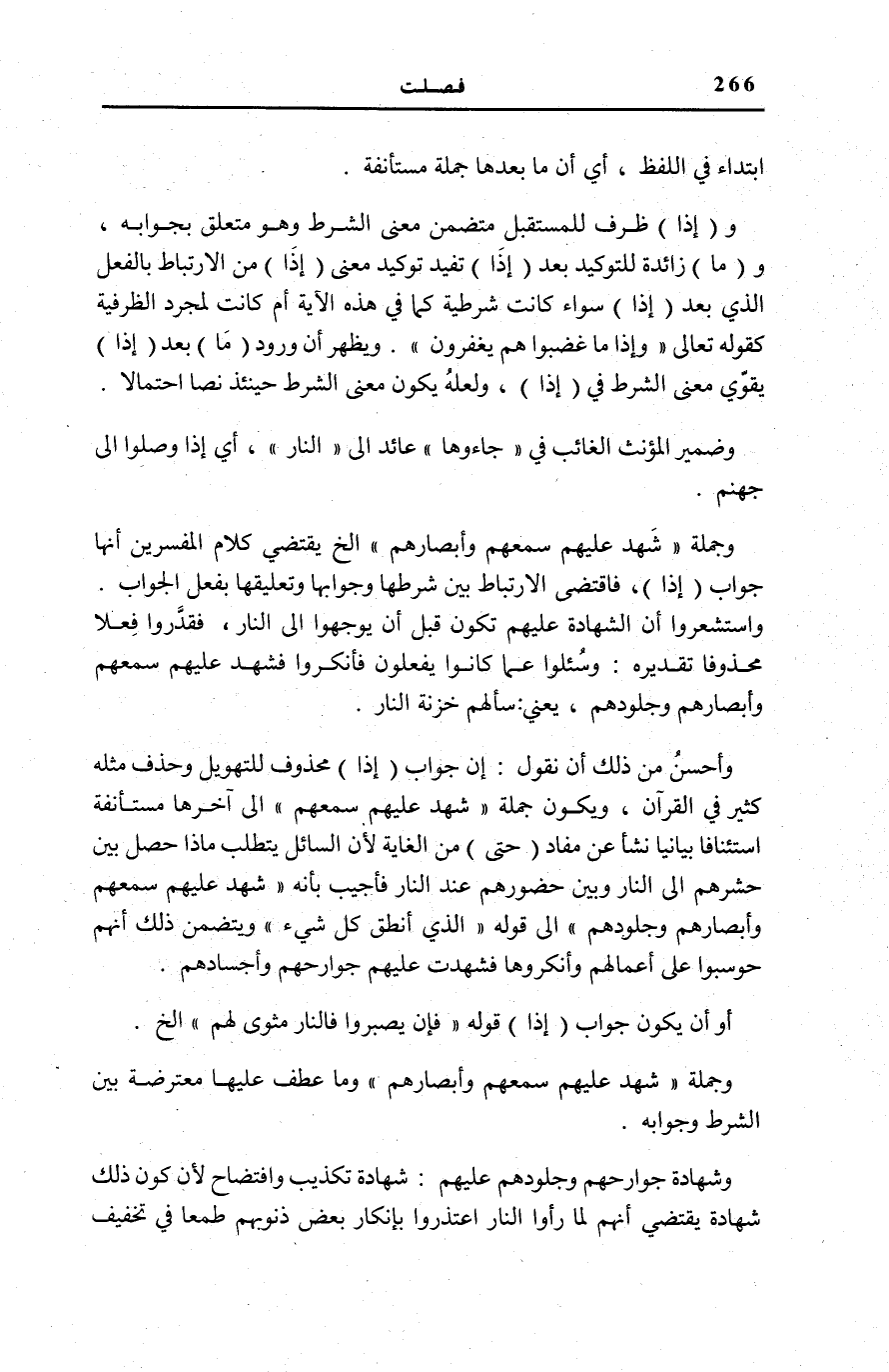 وَجُمْلَةُ شَهِدَ عَلَيْهِمْ سَمْعُهُمْ وَأَبْصارُهُمْ وَمَا عُطِفَ عَلَيْهَا مُعْتَرِضَةٌ بَيْنَ الشَّرْطِ وَجَوَابِهِ. وَشَهَادَةُ جَوَارِحِهِمْ وَجُلُودِهِمْ عَلَيْهِمْ: شَهَادَةُ تَكْذِيبٍ وَافْتِضَاحٍ لِأَنَّ كَوْنَ ذَلِكَ شَهَادَةً يَقْتَضِي أَنَّهُمْ لَمَّا رَأَوُا النَّارَ اعْتَذَرُوا بِإِنْكَارِ بَعْضِ ذُنُوبِهِمْ طَمَعًا فِي تَخْفِيفِ