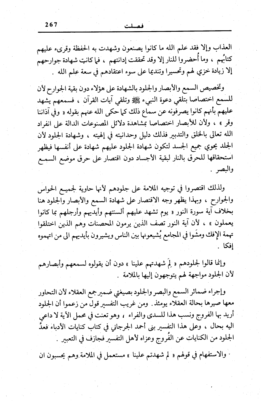 5] ، وَلِأَنَّ لِلْأَبْصَارِ اخْتِصَاصًا بِمُشَاهَدَةِ دَلَائِلِ الْمَصْنُوعَاتِ الدَّالَّةِ عَلَى انْفِرَادِ اللَّهِ تَعَالَى بِالْخَلْقِ وَالتَّدْبِيرِ فَذَلِكَ دَلِيلُ وَحْدَانِيَّتِهِ فِي إِلَهِيَّتِهِ، وَشَهَادَةِ الْجُلُودِ لِأَنَّ الْجِلْدَ يَحْوِي جَمِيعَ الْجَسَدِ لِتَكُونَ شَهَادَةُ الْجُلُودِ عَلَيْهِمْ شَهَادَةً عَلَى أَنْفُسِهَا فَيَظْهَرُ اسْتِحْقَاقُهَا لِلْحَرْقِ بِالنَّارِ لِبَقِيَّةِ الْأَجْسَادِ دُونَ اقْتِصَارٍ عَلَى حَرْقِ مَوْضِعِ السَّمْعِ وَالْبَصَرِ. وَلِذَلِكَ اقْتَصَرُوا فِي تَوْجِيهِ الْمَلَامَةِ عَلَى جُلُودِهِمْ لِأَنَّهَا حَاوِيَةٌ لِجَمِيعِ الْحَوَاسِّ وَالْجَوَارِحِ، وَبِهَذَا يَظْهَرُ وَجْهُ الِاقْتِصَارِ عَلَى شَهَادَةِ السَّمْعِ وَالْأَبْصَارِ وَالْجُلُودِ هُنَا بِخِلَافِ آيَةِ سُورَةِ النُّورِ [24] يَوْمَ تَشْهَدُ عَلَيْهِمْ أَلْسِنَتُهُمْ وَأَيْدِيهِمْ وَأَرْجُلُهُمْ بِما كانُوا يَعْمَلُونَ، لِأَنَّ آيَةَ النُّورِ تَصِفُ الَّذِينَ يَرْمُونَ