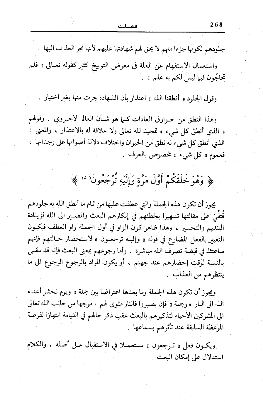 وَهُوَ خَلَقَكُمْ أَوَّلَ مَرَّةٍ وَإِلَيْهِ تُرْجَعُونَ يَجُوزُ أَنْ تَكُونَ هَذِهِ الْجُمْلَةُ وَالَّتِي عُطِفَتْ عَلَيْهَا مِنْ تَمَامِ مَا أَنْطَقَ اللَّهُ بِهِ جُلُودَهُمْ قُتُفِّيَ عَلَى مَقَالَتِهَا تَشْهِيرًا بِخَطَئِهِمْ فِي إِنْكَارِهِمُ الْبَعْثَ وَالْمَصِيرَ إِلَى اللَّهِ لِزِيَادَةِ التَّنْدِيمِ وَالتَّحْسِيرِ، وَهَذَا ظَاهِرُ كَوْنِ الْوَاوِ فِي أَوَّلِ الْجُمْلَةِ وَاوَ الْعَطْفِ فَيَكُونُ التَّعْبِيرُ بِالْفِعْلِ الْمُضَارِعِ فِي قَوْلِهِ: وَإِلَيْهِ تُرْجَعُونَ لِاسْتِحْضَارِ حَالَتِهِمْ فَإِنَّهُمْ سَاعَتَئِذٍ فِي قَبْضَةِ تَصَرُّفِ اللَّهِ مُبَاشَرَةً. وَأَمَّا رُجُوعُهُمْ بِمَعْنَى الْبَعْثِ فَإِنَّهُ قَدْ مَضَى بِالنِّسْبَةِ لِوَقْتِ إِحْضَارِهِمْ عِنْدَ جَهَنَّمَ، أَوْ يَكُونُ الْمُرَادُ بِالرُّجُوعِ الرُّجُوعَ إِلَى مَا يَنْتَظِرُهُمْ مِنَ الْعَذَابِ.