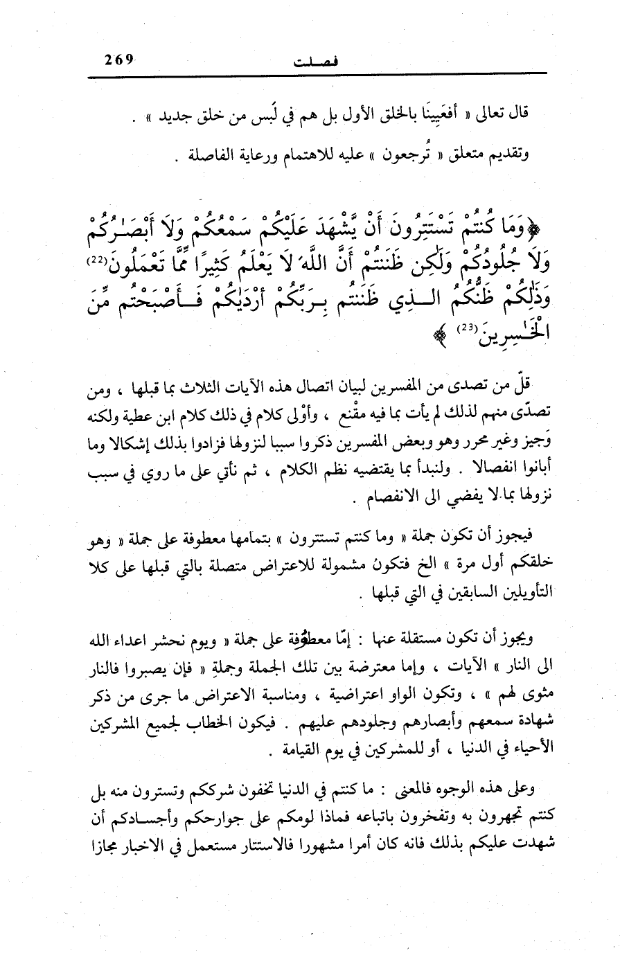 وَما كُنْتُمْ تَسْتَتِرُونَ أَنْ يَشْهَدَ عَلَيْكُمْ سَمْعُكُمْ وَلا أَبْصارُكُمْ وَلا جُلُودُكُمْ وَلكِنْ ظَنَنْتُمْ أَنَّ اللَّهَ لَا يَعْلَمُ كَثِيراً مِمَّا تَعْمَلُونَ (22) وَذلِكُمْ ظَنُّكُمُ الَّذِي ظَنَنْتُمْ بِرَبِّكُمْ أَرْداكُمْ فَأَصْبَحْتُمْ مِنَ الْخاسِرِينَ (23)