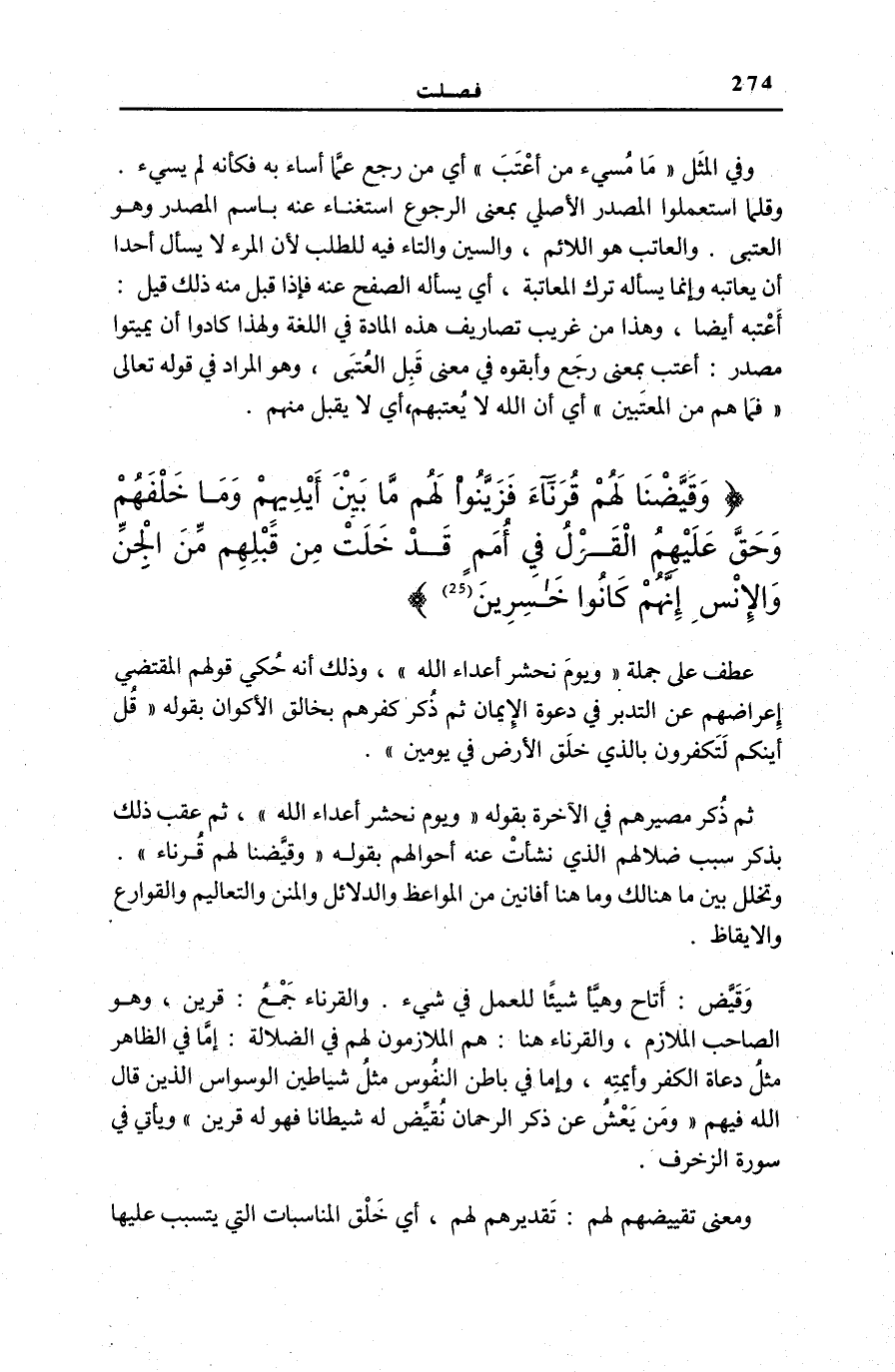 وَقَيَّضْنا لَهُمْ قُرَناءَ فَزَيَّنُوا لَهُمْ مَا بَيْنَ أَيْدِيهِمْ وَما خَلْفَهُمْ وَحَقَّ عَلَيْهِمُ الْقَوْلُ فِي أُمَمٍ قَدْ خَلَتْ مِنْ قَبْلِهِمْ مِنَ الْجِنِّ وَالْإِنْسِ إِنَّهُمْ كانُوا خاسِرِينَ (25)