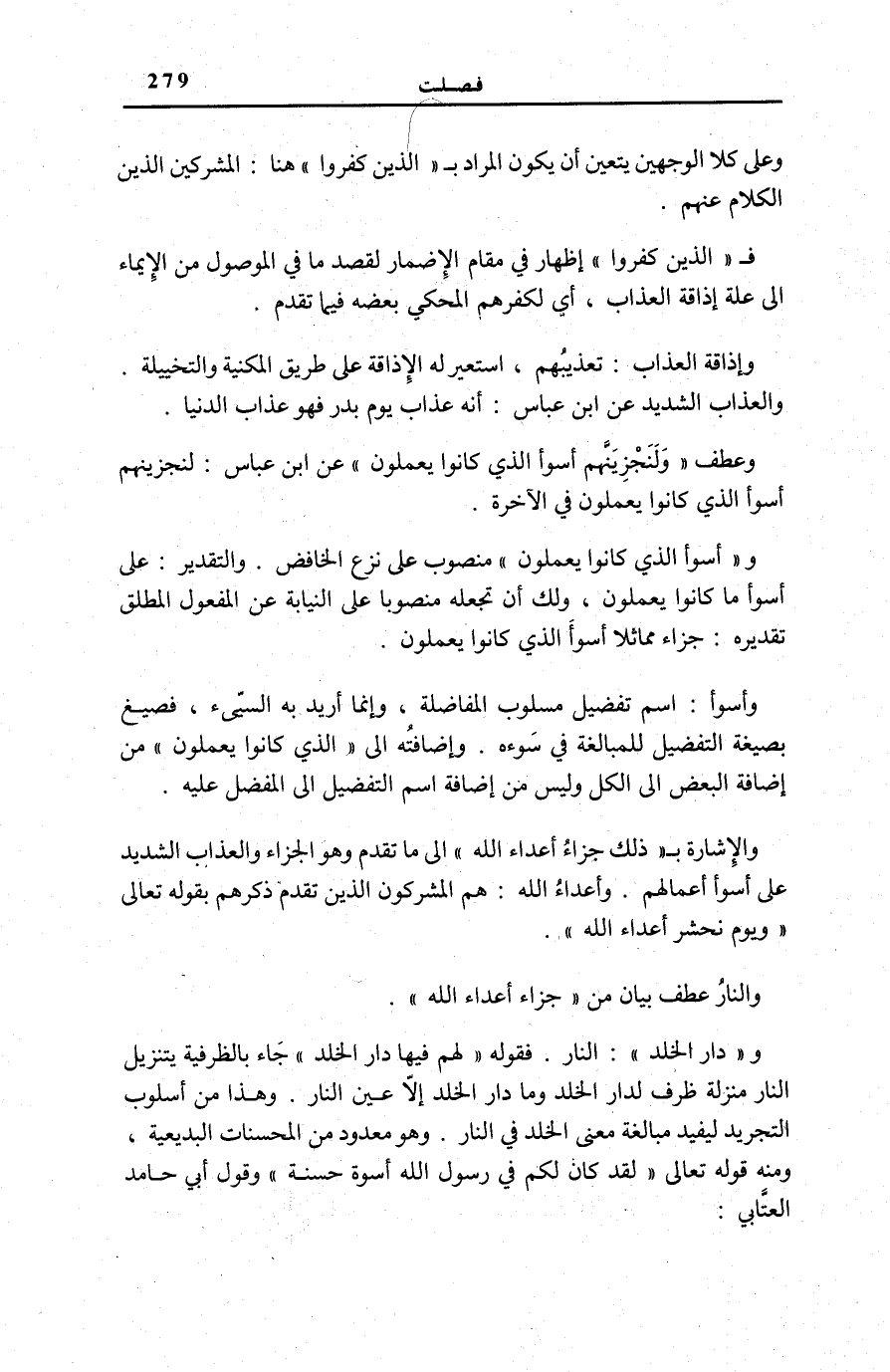 وَالْإِشَارَةُ بِ ذلِكَ جَزاءُ أَعْداءِ اللَّهِ إِلَى مَا تَقَدَّمَ وَهُوَ الْجَزَاءُ وَالْعَذَابُ الشَّدِيدُ عَلَى أَسْوَأِ أَعْمَالِهِمْ. وَأَعْدَاءُ اللَّهِ: هُمُ الْمُشْرِكُونَ الَّذِينَ تَقَدَّمَ ذِكْرُهُمْ بِقَوْلِهِ تَعَالَى: وَيَوْمَ نَحْشُرُ أَعْداءُ اللَّهِ [فصلت: 19] .