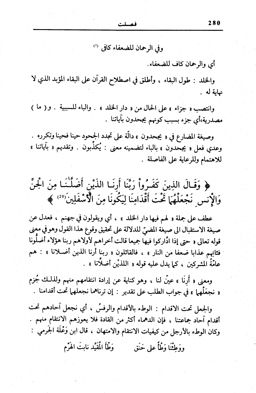 عطف على جملَة لَهُمْ فِيها دارُ الْخُلْدِ [فصلت: 28] ، أَيْ وَيَقُولُونَ فِي جَهَنَّمَ، فَعَدَلَ عَنْ صِيغَةِ الِاسْتِقْبَالِ إِلَى صِيغَةِ الْمُضِيِّ لِلدَّلَالَةِ عَلَى تَحْقِيقِ وُقُوعِ هَذَا الْقَوْلِ وَهُوَ فِي مَعْنَى قَوْلِهِ تَعَالَى: حَتَّى إِذَا ادَّارَكُوا فِيها جَمِيعاً قالَتْ أُخْراهُمْ لِأُولاهُمْ رَبَّنا هؤُلاءِ أَضَلُّونا فَآتِهِمْ عَذاباً ضِعْفاً مِنَ النَّارِ [الْأَعْرَاف: 38] ، فَالْقَائِلُونَ رَبَّنا أَرِنَا الَّذَيْنِ أَضَلَّانا: هُمْ عَامَّةُ الْمُشْرِكِينَ، كَمَا يَدُلُّ عَلَيْهِ قَوْله: الَّذَيْنِ أَضَلَّانا وَمَعْنَى أَرِنَا عَيِّنْ لَنَا، وَهُوَ كِنَايَةٌ عَنْ إِرَادَةِ انْتِقَامِهِمْ مِنْهُمْ وَلِذَلِكَ جَزَمَ نَجْعَلْهُما فِي جَوَابِ الطَّلَبِ عَلَى تَقْدِيرِ: إِنْ تُرِنَاهُمَا نَجْعَلْهُمَا تَحْتَ أَقْدَامِنَا.