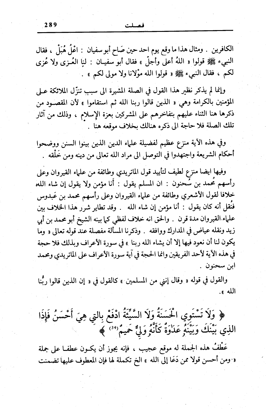 وَفِي هَذِهِ الْآيَةِ مَنْزَعٌ عَظِيمٌ لِفَضِيلَةِ عُلَمَاءِ الدِّينِ الَّذِينَ بَيَّنُوا السُّنَنَ وَوَضَّحُوا أَحْكَامَ الشَّرِيعَةِ وَاجْتَهَدُوا فِي التَّوَصُّلِ إِلَى مُرَادِ اللَّهِ تَعَالَى مِنْ دِينِهِ وَمِنْ خُلُقِهِ. وَفِيهَا أَيْضًا مَنْزَعٌ لَطِيفٌ لِتَأْيِيدِ قَوْلِ الْمَاتُرِيدِيِّ وَطَائِفَةٍ مِنْ عُلَمَاءِ الْقَيْرَوَانِ وَعَلَى رَأْسِهِمْ مُحَمَّدُ بْنُ سَحْنُونٍ: إِنَّ الْمُسْلِمَ يَقُولُ: أَنَا مُؤْمِنٌ وَلَا يَقُولُ إِنْ شَاءَ اللَّهُ خِلَافًا لِقَوْلِ الْأَشْعَرِيِّ وَطَائِفَةٍ مِنْ عُلَمَاءِ الْقَيْرَوَانِ وَعَلَى رَأْسِهِمْ مُحَمَّدُ بْنُ عَبْدُوسَ فَنُقِلَ أَنَّهُ كَانَ يَقُولُ: أَنَا مُؤْمِنٌ إِنْ شَاءَ اللَّهُ. وَقَدْ تَطَايَرَ شَرَرُ هَذَا الْخِلَافِ بَيْنَ عُلَمَاءِ الْقَيْرَوَانِ مُدَّةَ قَرْنٍ. وَالْحَقُّ أَنَّهُ خِلَافٌ لَفْظِيٌّ كَمَا بَيَّنَهُ الشَّيْخُ أَبُو مُحَمَّدِ بْنُ أَبِي زَيْدٍ وَنَقَلَهُ عِيَاضٌ فِي «الْمَدَارِكِ» وَوَافَقَهُ. وَذَكَرْنَا الْمَسْأَلَةَ مُفَصَّلَةً عِنْدَ قَوْلِهِ تَعَالَى: وَما يَكُونُ لَنا أَنْ نَعُودَ فِيها إِلَّا أَنْ يَشاءَ اللَّهُ رَبُّنا فِي سُورَةِ الْأَعْرَافِ [89] وَبِذَلِكَ فَلَا حُجَّةَ فِي هَذِهِ الْآيَةِ لِأَحَدِ الْفَرِيقَيْنِ وَإِنَّمَا الْحُجَّةُ فِي آيَةِ سُورَةِ الْأَعْرَافِ عَلَى الْمَاتُرِيدِيِّ وَمُحَمَّدِ بْنِ سَحْنُونٍ. وَالْقَوْلُ فِي قَوْلِهِ: وَقالَ إِنَّنِي مِنَ الْمُسْلِمِينَ كَالْقَوْلِ فِي إِنَّ الَّذِينَ قالُوا رَبُّنَا اللَّهُ [فصلت: 30] .