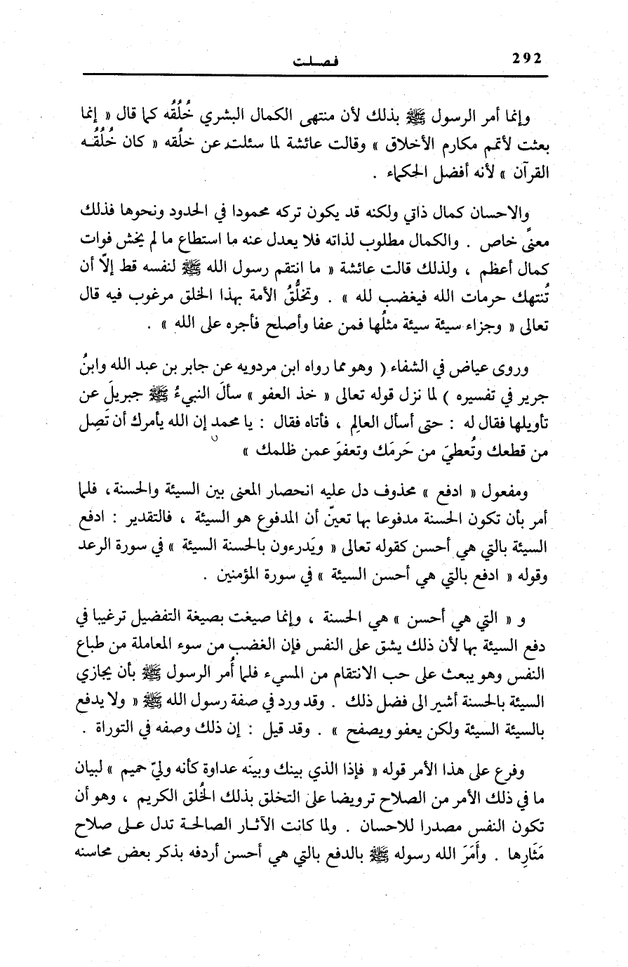 وَرَوَى عِيَاضٌ فِي «الشِّفَاءِ» وَهُوَ مِمَّا رَوَاهُ ابْنُ مَرْدَوَيْهِ عَنْ جَابِرِ بْنِ عَبْدِ اللَّهِ وَابْنُ جَرِيرٍ فِي «تَفْسِيرِهِ» لَمَّا نَزَلَ قَوْلُهُ تَعَالَى: خُذِ الْعَفْوَ [الْأَعْرَاف: 199] سَأَلَ النبيء صَلَّى اللهُ عَلَيْهِ وَسَلَّمَ جِبْرِيلَ عَنْ تَأْوِيلِهَا فَقَالَ لَهُ: حَتَّى أَسْأَلَ الْعَالِمَ، فَأَتَاهُ فَقَالَ: «يَا مُحَمَّدُ إِنَّ اللَّهَ يَأْمُرُكَ أَنْ تَصِلَ مَنْ قَطَعَكَ وَتُعْطِيَ مَنْ حَرَمَكَ وَتَعْفُوَ عَمَّنْ ظَلَمَكَ»
