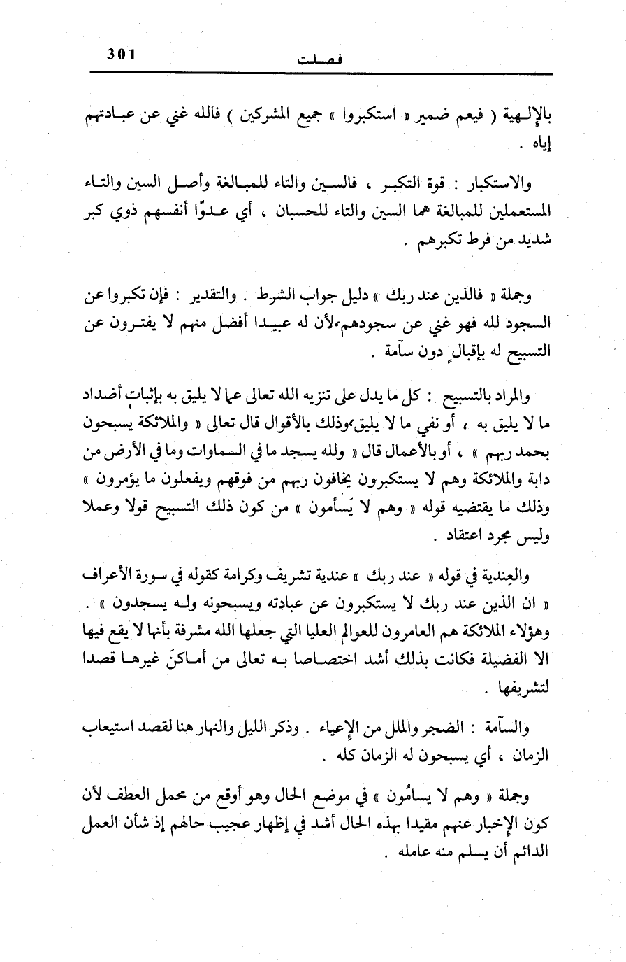 وَجُمْلَةُ: فَالَّذِينَ عِنْدَ رَبِّكَ دَلِيلُ جَوَابِ الشَّرْطِ. وَالتَّقْدِيرُ: فَإِنْ تَكَبَّرُوا عَنِ السُّجُودِ لِلَّهِ فَهُوَ غَنِيٌّ عَنْ سُجُودِهِمْ، لِأَنَّ لَهُ عَبِيدًا أَفْضَلَ مِنْهُمْ لَا يَفْتُرُونَ عَنِ التَّسْبِيحِ لَهُ بِإِقْبَالٍ دُونَ سَآمَةٍ.