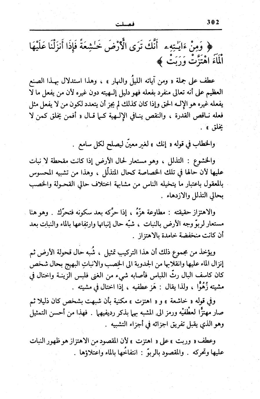 وَفِي قَوْلِهِ: خاشِعَةً واهْتَزَّتْ مَكْنِيَّةٌ بِأَنْ شُبِّهَتْ بِشَخْصٍ كَانَ ذَلِيلًا ثُمَّ صَارَ مُهْتَزًّا لِعِطْفَيْهِ وَرَمَزَ إِلَى الْمُشَبَّهِ بِهِمَا بِذِكْرِ رَدِيفَيْهِمَا. فَهَذَا مِنْ أَحْسَنِ التَّمْثِيلِ وَهُوَ الَّذِي يَقْبَلُ تَفْرِيقَ أَجْزَائِهِ فِي أَجْزَاءِ التَّشْبِيهِ.