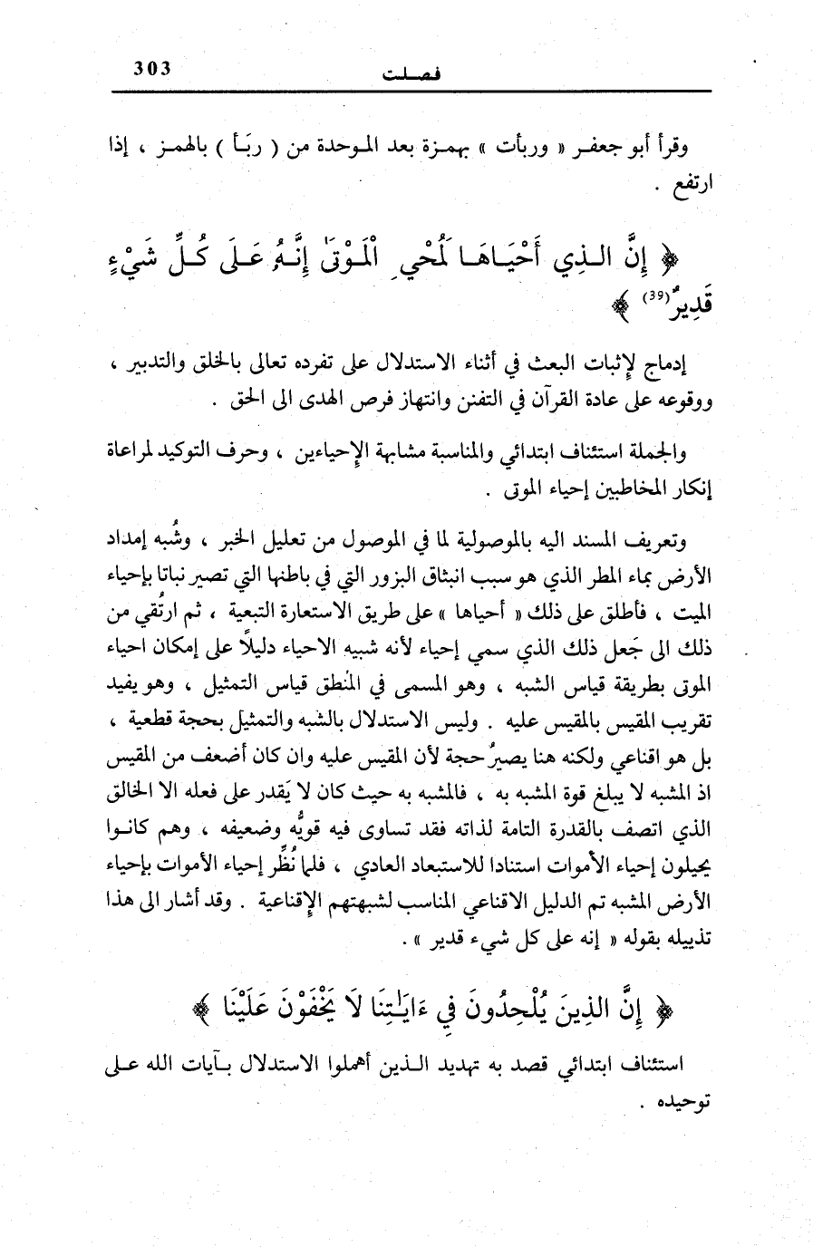 إِنَّ الَّذِي أَحْياها لَمُحْيِ الْمَوْتى إِنَّهُ عَلى كُلِّ شَيْءٍ قَدِيرٌ إِدْمَاجٌ لِإِثْبَاتِ الْبَعْثِ فِي أَثْنَاءِ الِاسْتِدْلَالِ عَلَى تَفَرُّدِهِ تَعَالَى بِالْخَلْقِ وَالتَّدْبِيرِ، وَوُقُوعِهِ عَلَى عَادَةِ الْقُرْآنِ فِي التَّفَنُّنِ وَانْتِهَازِ فُرَصِ الْهُدَى إِلَى الْحَقِّ.