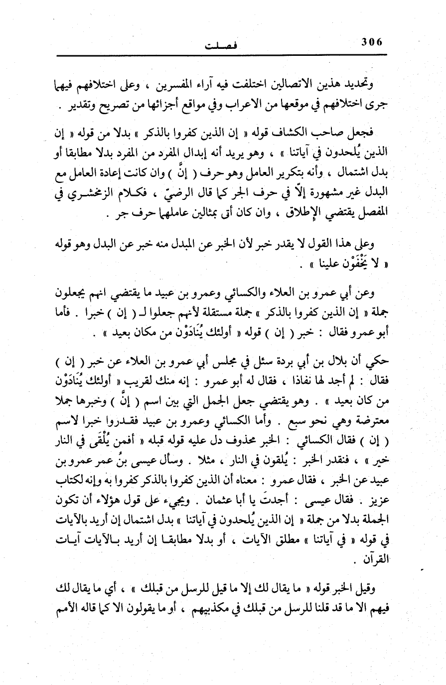 فَجَعَلَ صَاحِبُ «الْكَشَّافِ» قَوْلَهُ: إِنَّ الَّذِينَ كَفَرُوا بِالذِّكْرِ بَدَلًا مِنْ قَوْلِهِ: إِنَّ الَّذِينَ يُلْحِدُونَ فِي آياتِنا، وَهُوَ يُرِيدُ أَنَّهُ إِبْدَالُ الْمُفْرَدِ مِنَ الْمُفْرَدِ بَدَلًا مُطَابِقًا أَوْ بَدَلَ اشْتِمَالٍ، وَأَنَّهُ بِتَكْرِيرِ الْعَامِلِ وَهُوَ حَرْفُ إِنَّ وَإِنْ كَانَتْ إِعَادَةُ الْعَامِلِ مَعَ الْبَدَل غير مَشْهُورَة إِلَّا فِي حَرْفِ الْجَرِّ كَمَا قَالَ الرَّضِيُّ، فَكَلَامُ الزَّمَخْشَرِيِّ فِي «الْمُفَصَّلِ» يَقْتَضِي الْإِطْلَاقَ، وَإِنْ كَانَ أَتَى بِمِثَالَيْنِ عَامِلُهُمَا حَرْفُ جَرٍّ.