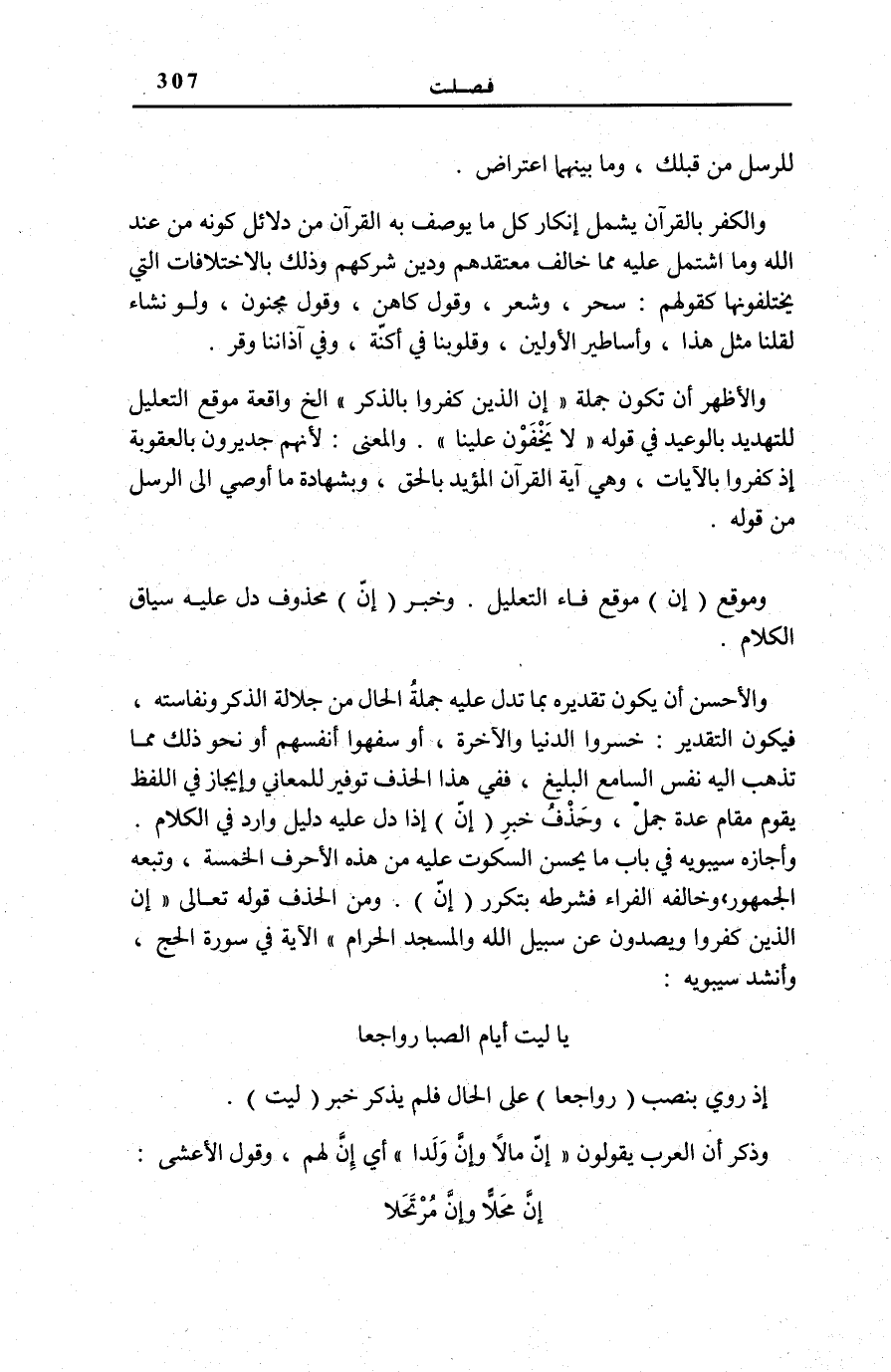 وَالْأَحْسَنُ أَنْ يَكُونَ تَقْدِيره بِمَا تدل عَلَيْهِ جُمْلَةُ الْحَالِ مِنْ جَلَالَةِ الذِّكْرِ وَنَفَاسَتِهِ، فَيَكُونُ التَّقْدِيرُ: خَسِرُوا الدُّنْيَا وَالْآخِرَةَ، أَوْ سَفَّهُوا أَنْفُسَهُمْ أَوْ نَحْوَ ذَلِكَ مِمَّا تَذْهَبُ إِلَيْهِ نَفْسُ السَّامِعِ الْبَلِيغِ، فَفِي هَذَا الْحَذْفِ تَوْفِيرٌ لِلْمَعَانِي وَإِيجَازٌ فِي اللَّفْظِ يَقُومُ مَقَامَ عِدَّةِ جُمَلٍ، وَحَذْفُ خَبَرِ إِنَّ إِذَا دَلَّ عَلَيْهِ دَلِيلٌ وَارِدٌ فِي الْكَلَامِ. وَأَجَازَهُ سِيبَوَيْهِ فِي بَابِ مَا يَحْسُنُ السُّكُوتُ عَلَيْهِ مِنْ هَذِهِ الْأَحْرُفِ الْخَمْسَةِ، وَتَبِعَهُ الْجُمْهُورُ، وَخَالَفَهُ الْفَرَّاءُ فَشَرَطَهُ بِتَكَرُّرِ إِنَّ. وَمِنَ الْحَذْفِ قَوْلُهُ تَعَالَى: إِنَّ الَّذِينَ كَفَرُوا وَيَصُدُّونَ عَنْ سَبِيلِ اللَّهِ وَالْمَسْجِدِ الْحَرامِ الْآيَةُ فِي سُورَةِ الْحَجِّ [25] ، وَأَنْشَدَ سِيبَوَيْهِ: